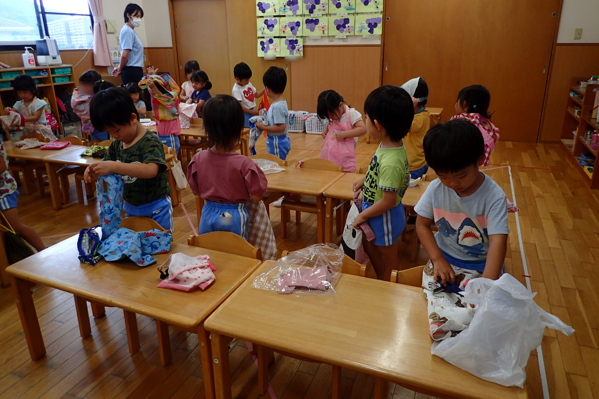 お家の人に用意してもらったエプロンを見せながら、「見て!ピンク色のエプロンやで」「ママとつけるの練習してきたよ」と、朝から会話が弾んでいました。