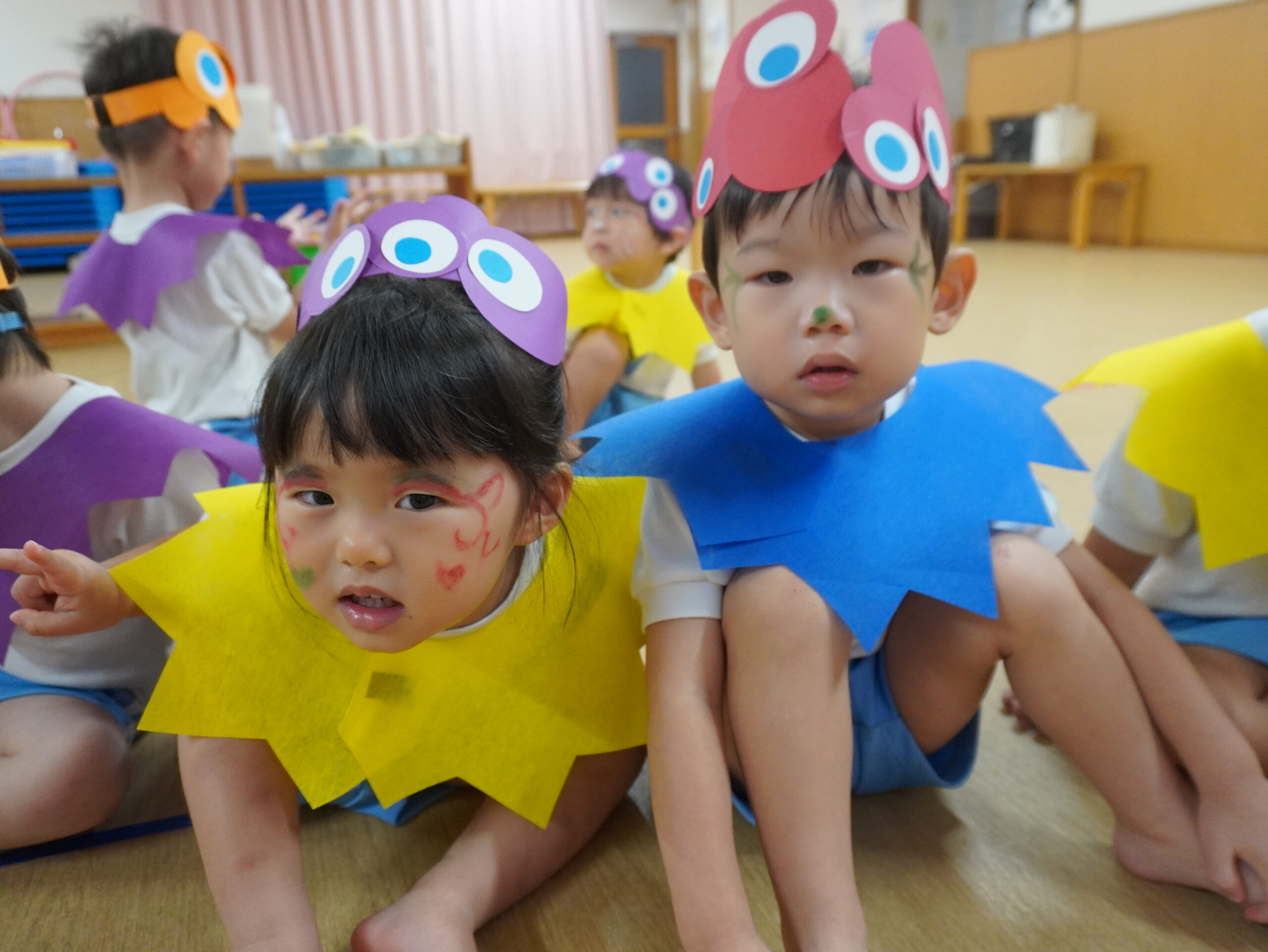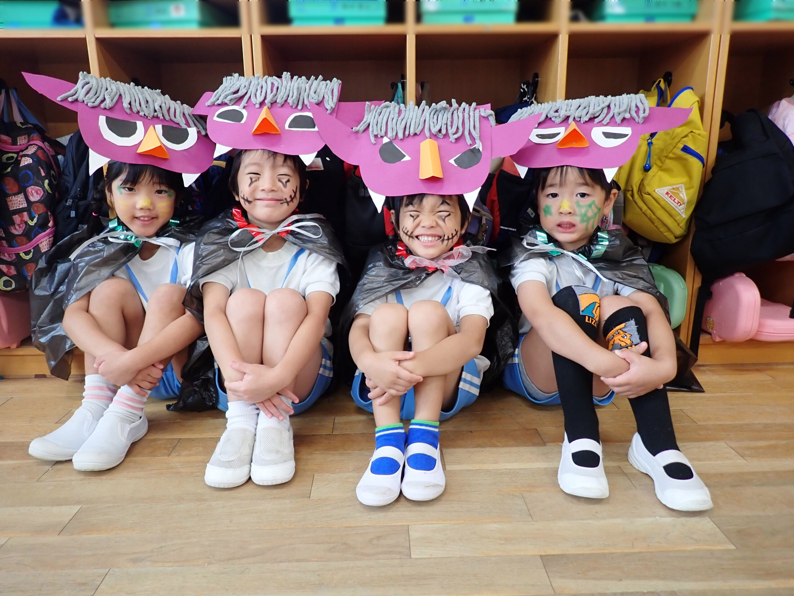 各クラス自分達で作った被り物をつけて参加しました。