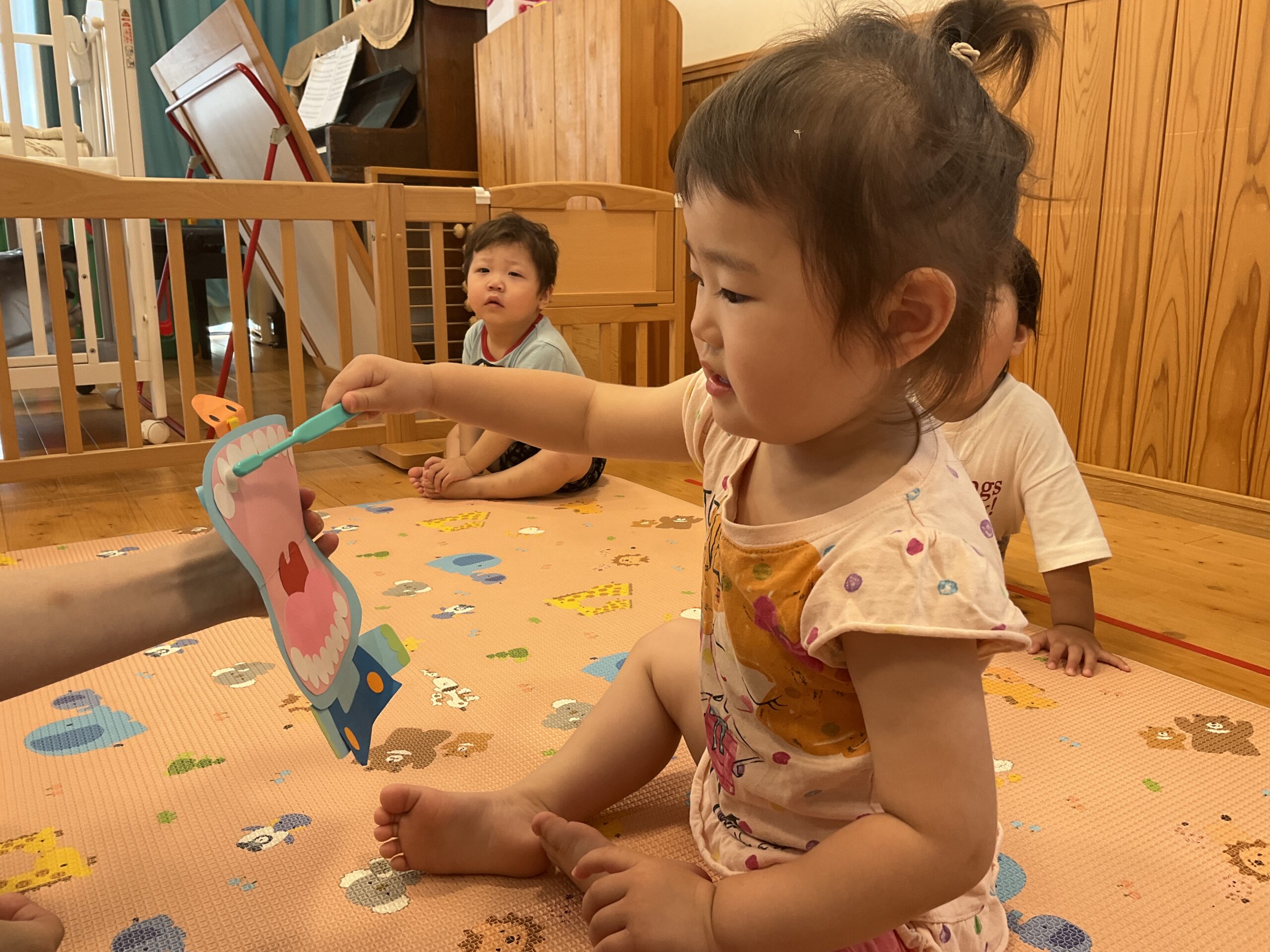口を大きく開ける練習もしました。歯科検診ではみんな大きな口を開けて泣かずに受けることができましたよ🦷