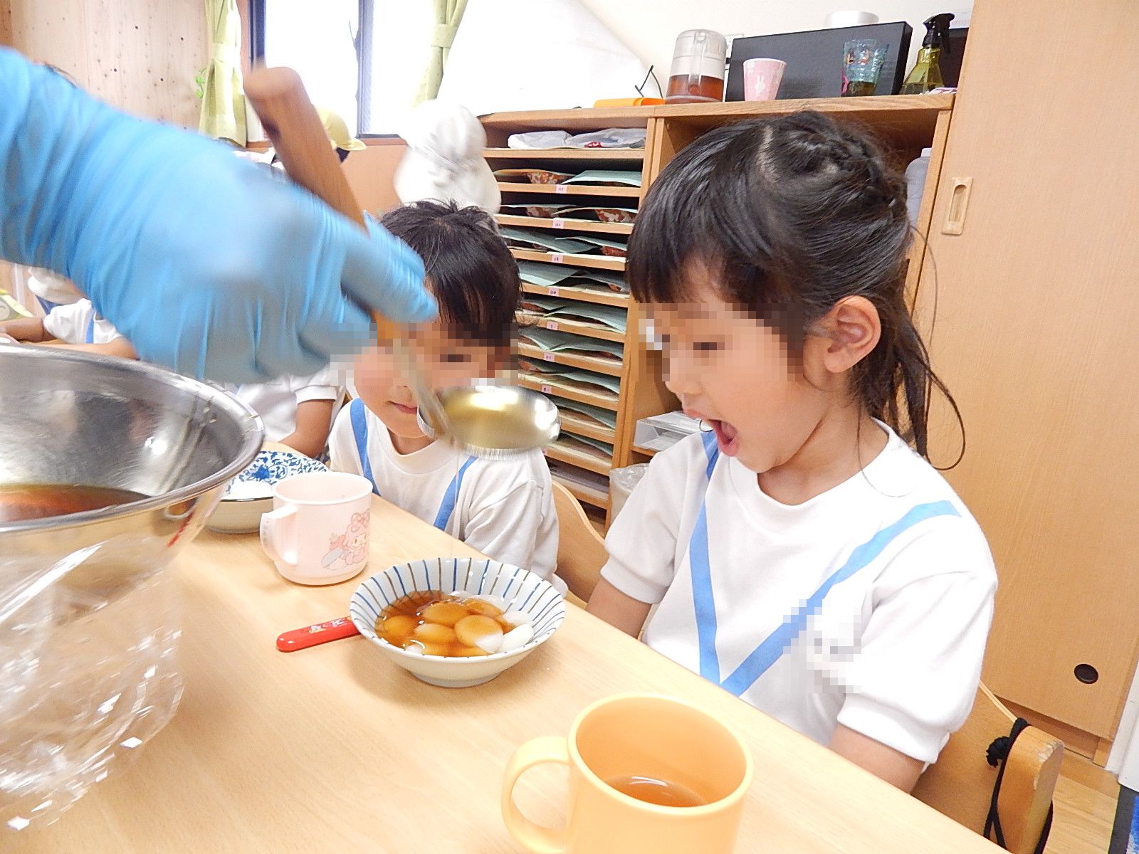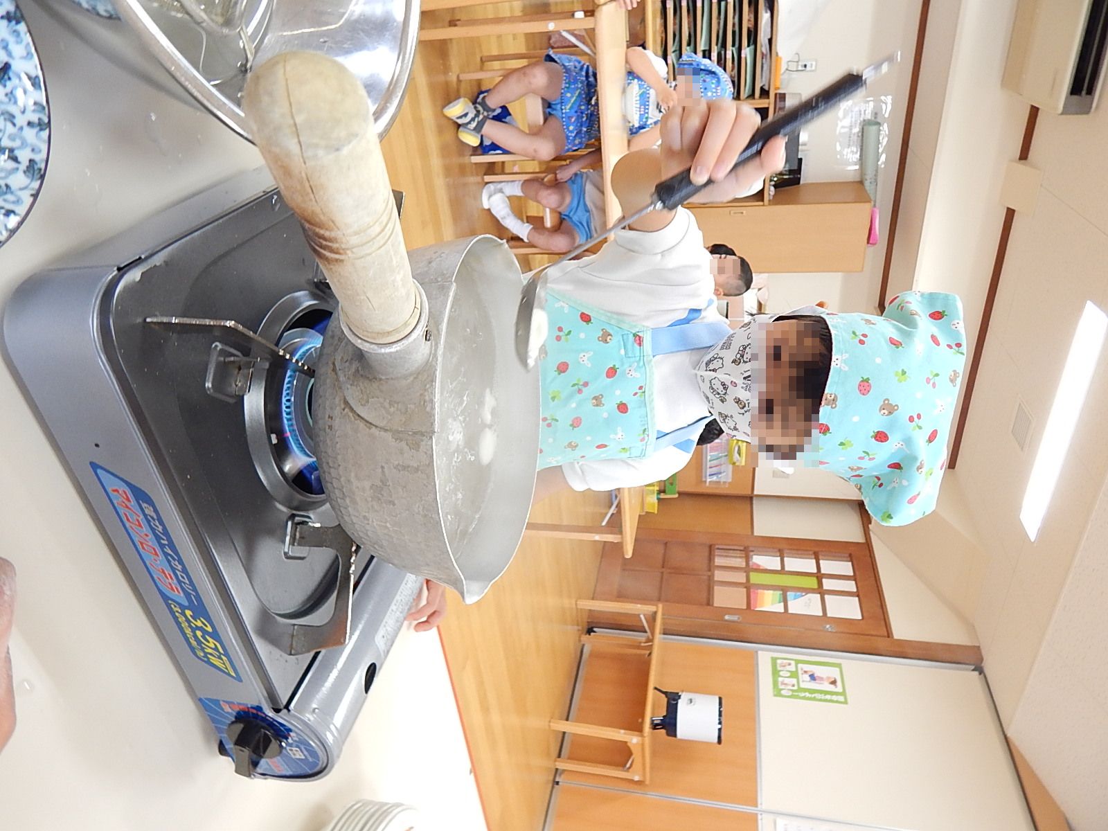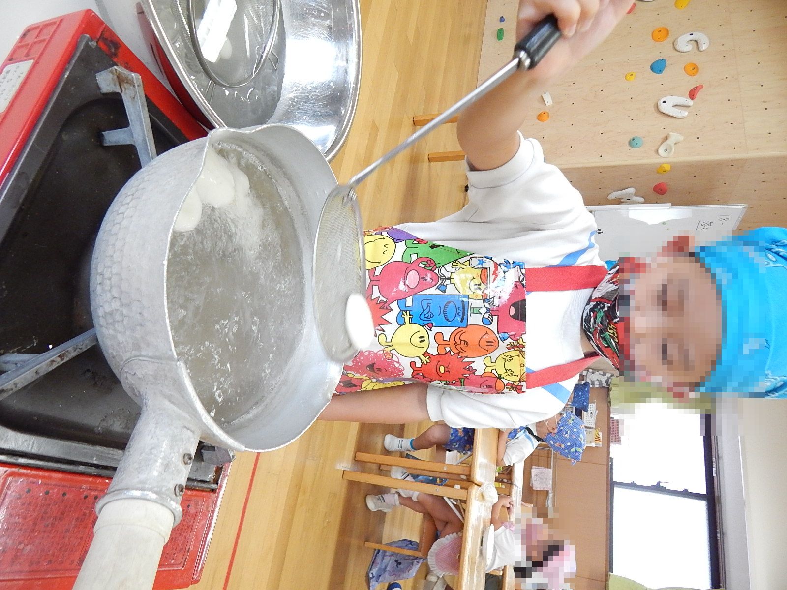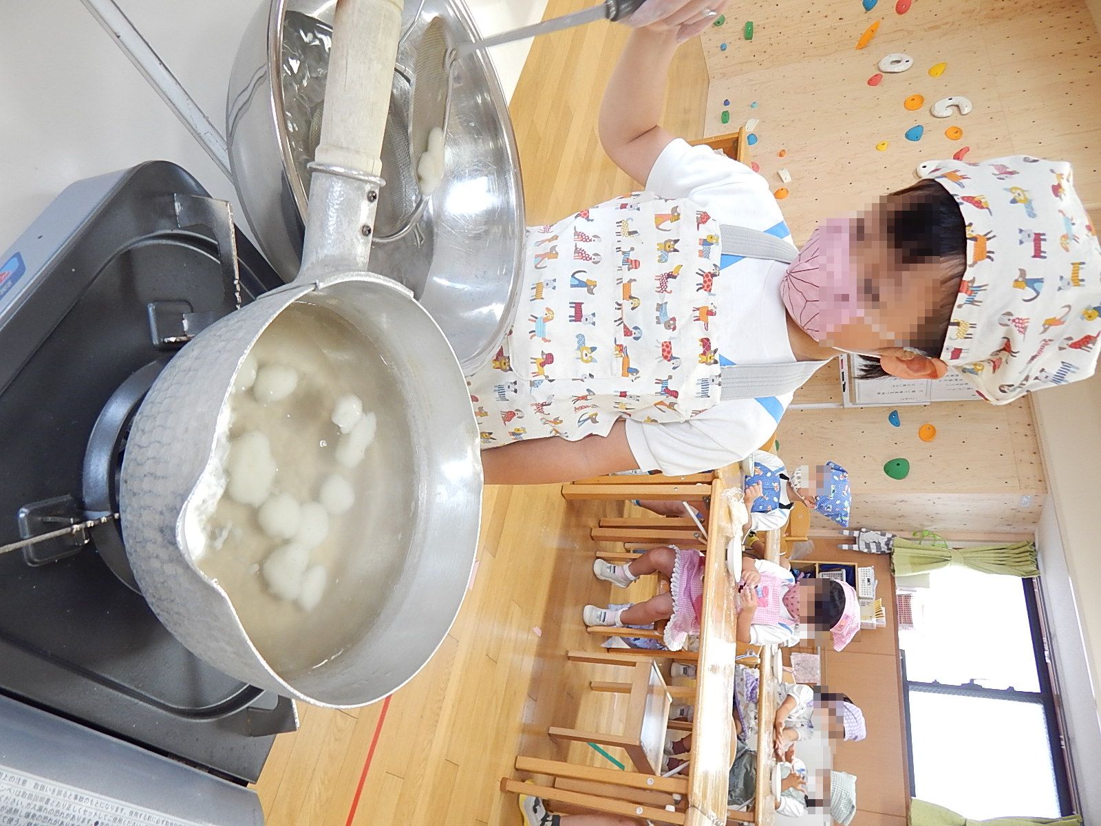 そして、自分で丸めた団子を茹でました。アツアツのお湯を目の前に「熱いなあ」と言いながらも、丁寧にこなす子どもたちでした!