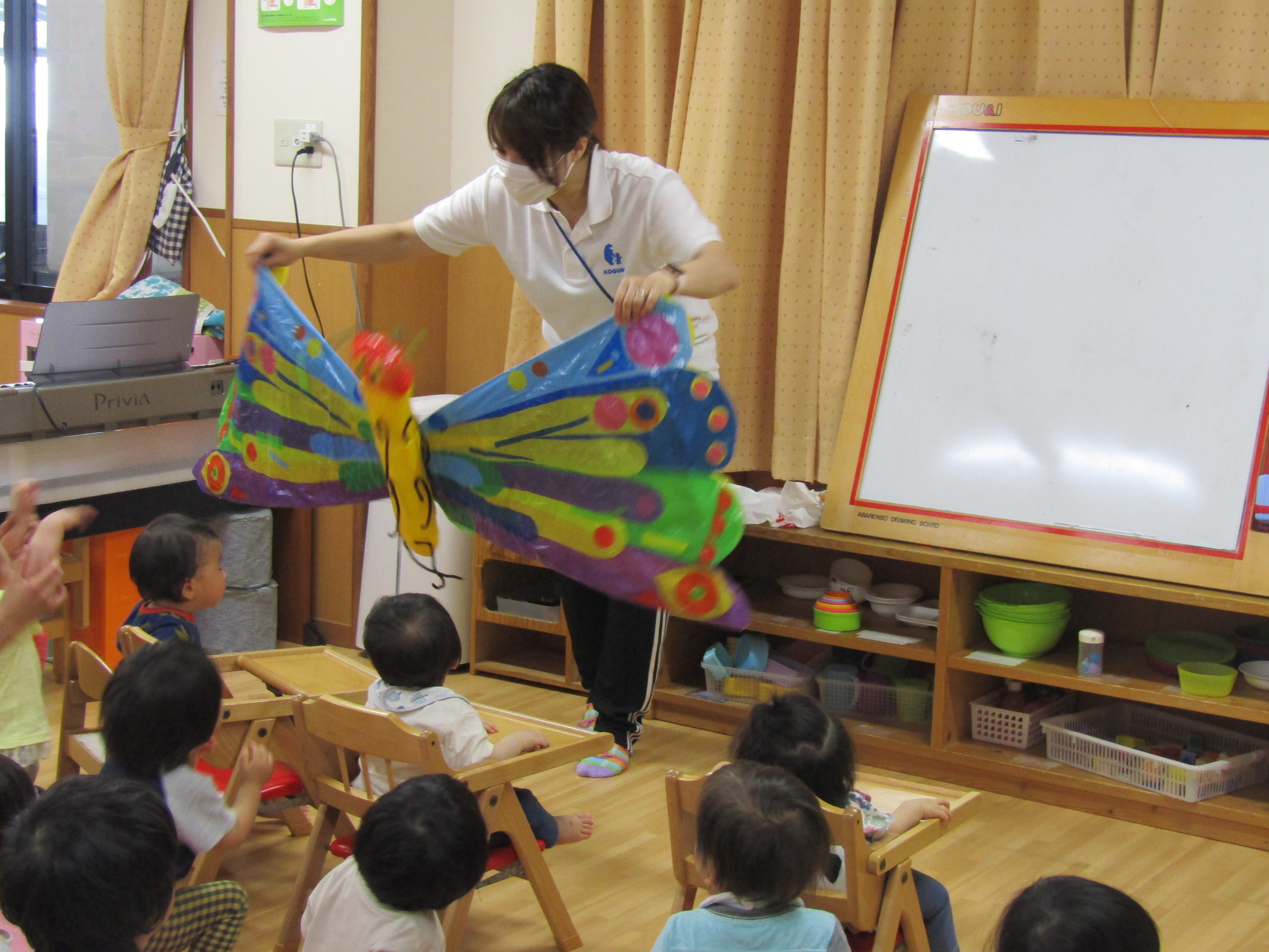 一緒に歌ったり踊ったりしてくれました。最後に出てきたちょうちょにはみんなびっくりと、おおよろこび!近くに飛んでくるとナデナデしてくれていました。