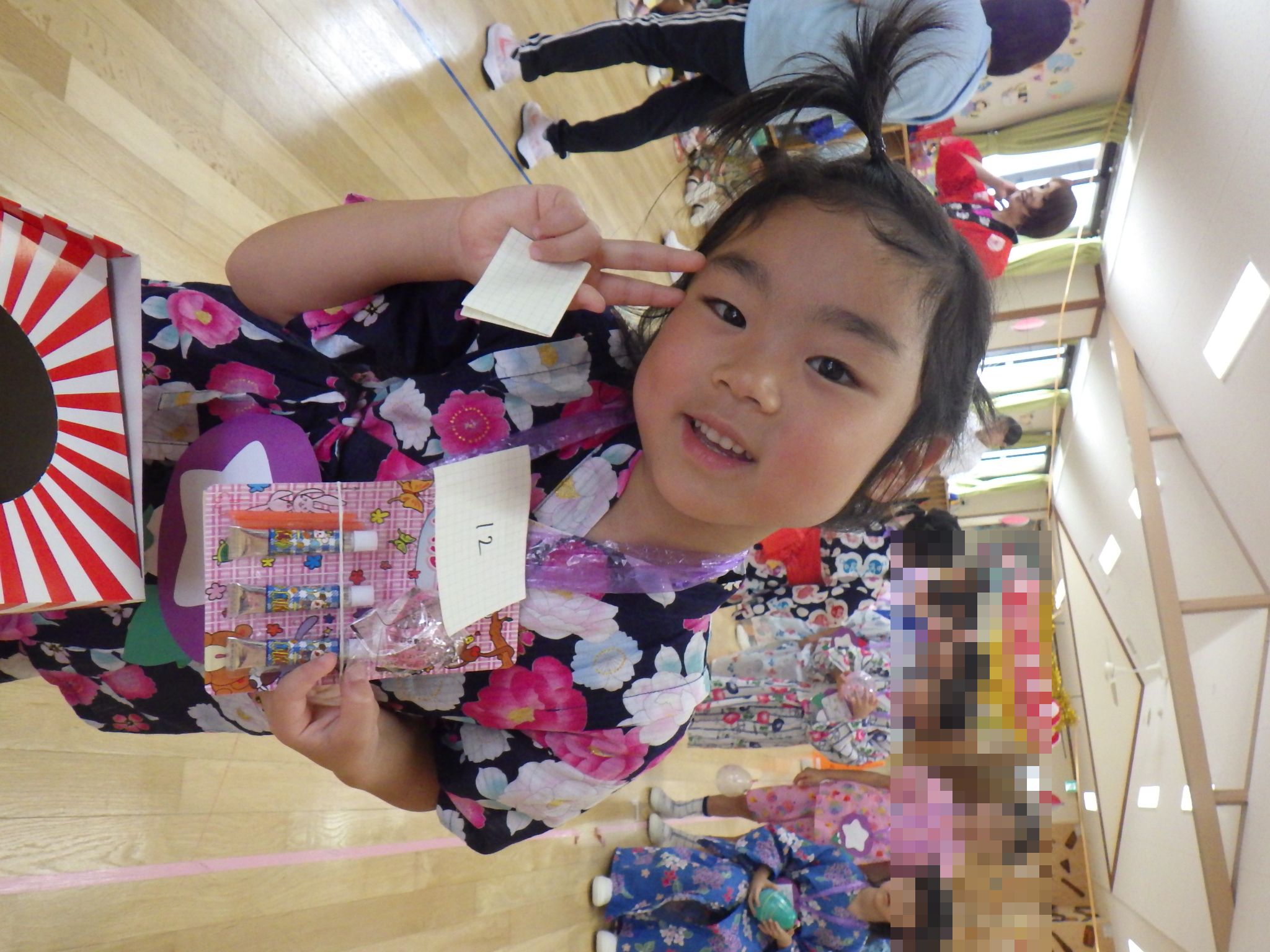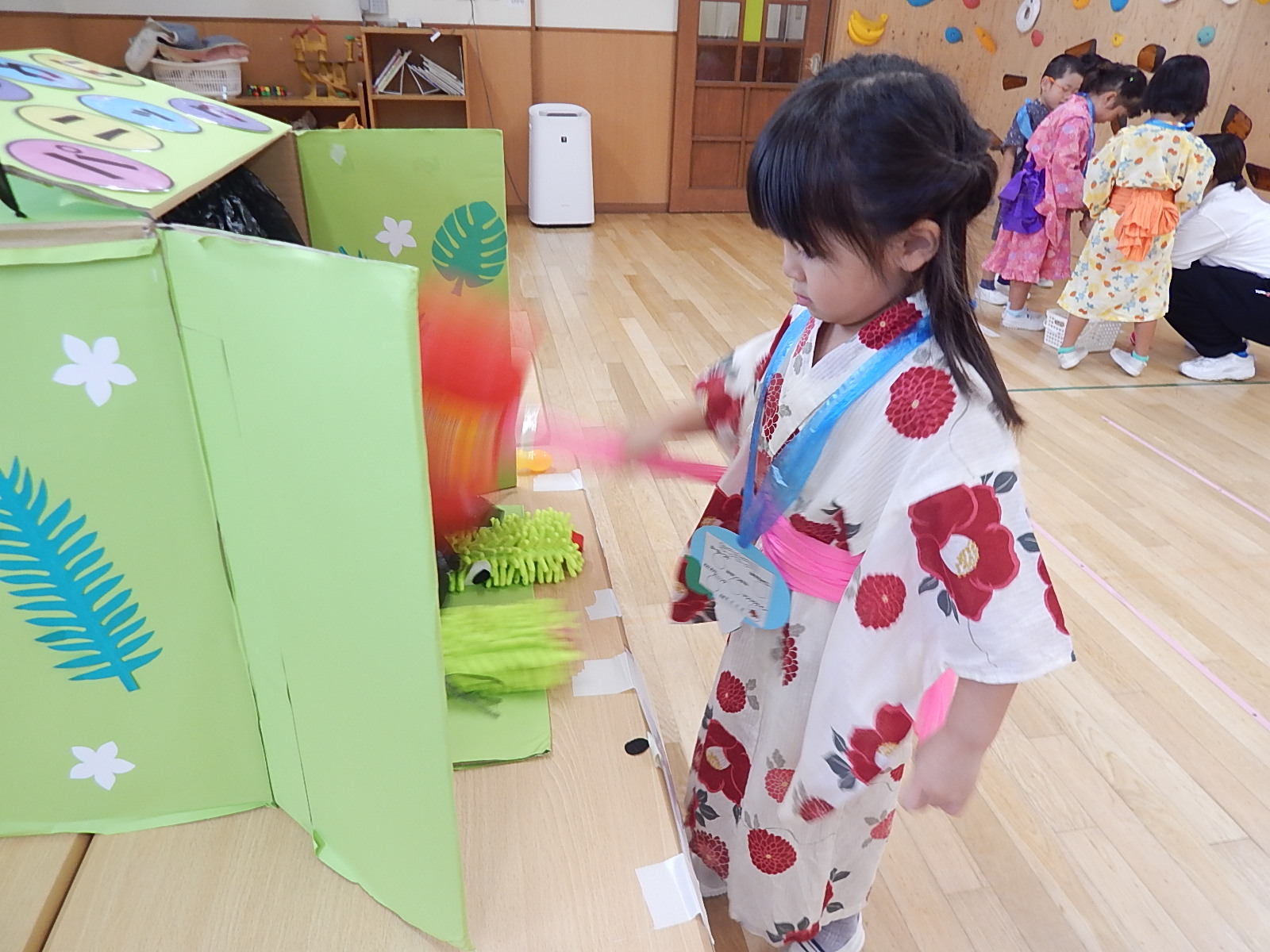 幼児さんは、ヨーヨー釣り、ワニワニパニック、マジック9、おかしつかみ、おもちゃくじ、うちわ作りを楽しみました。