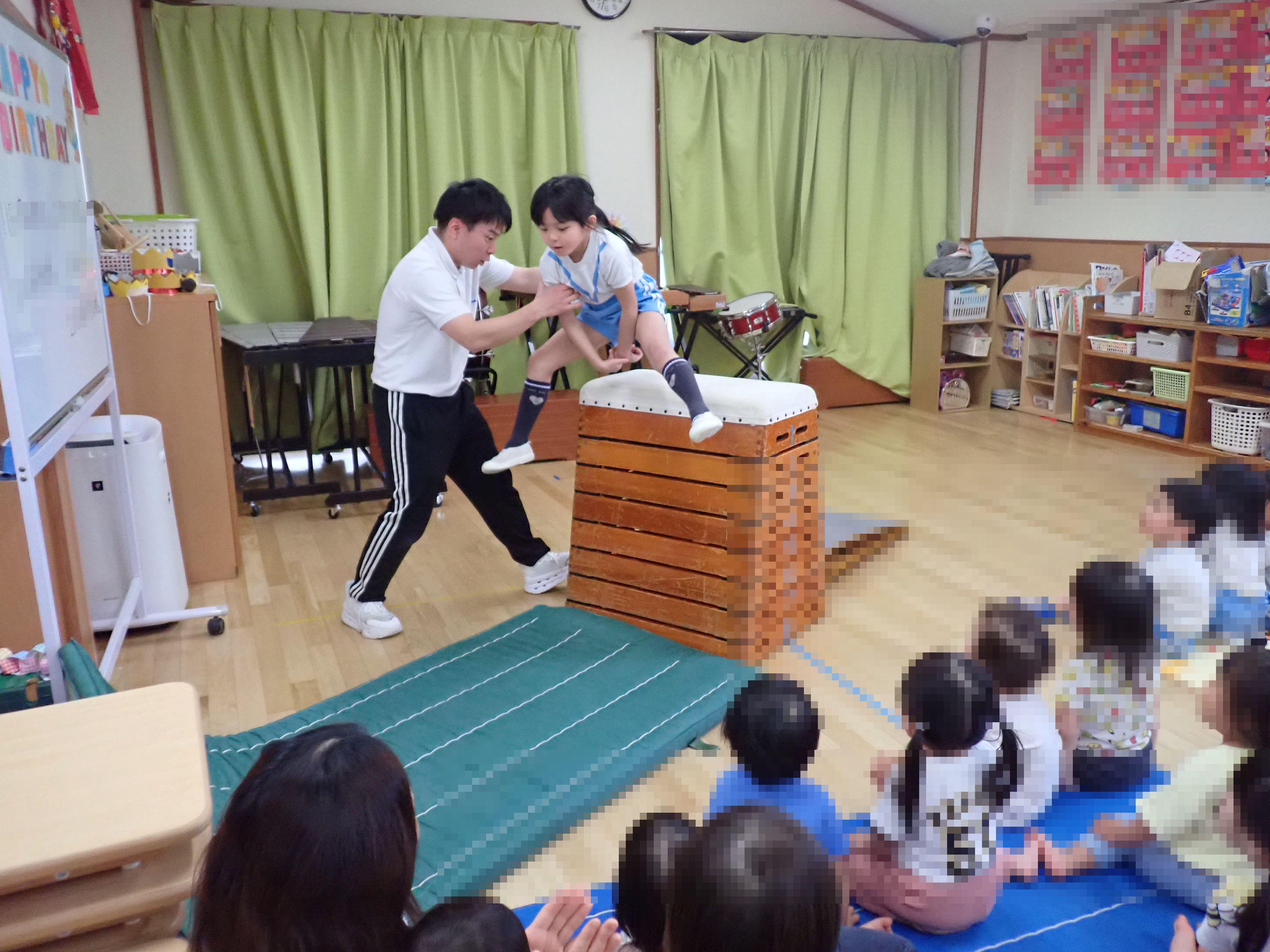 特技披露では、はな組さんは2人ともマットで前回りを、そらひかり組さんは跳び箱8段を披露してくれました。最後のポーズまでかっこよかったです!