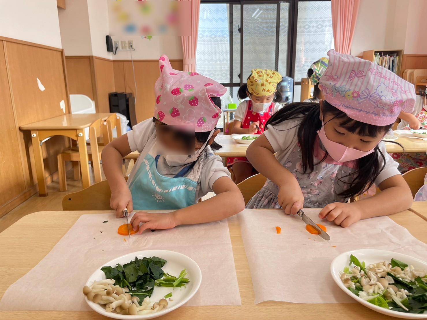 ほうれん草はとしめじは手でちぎり、にんじんはイチョウ切りにしました。