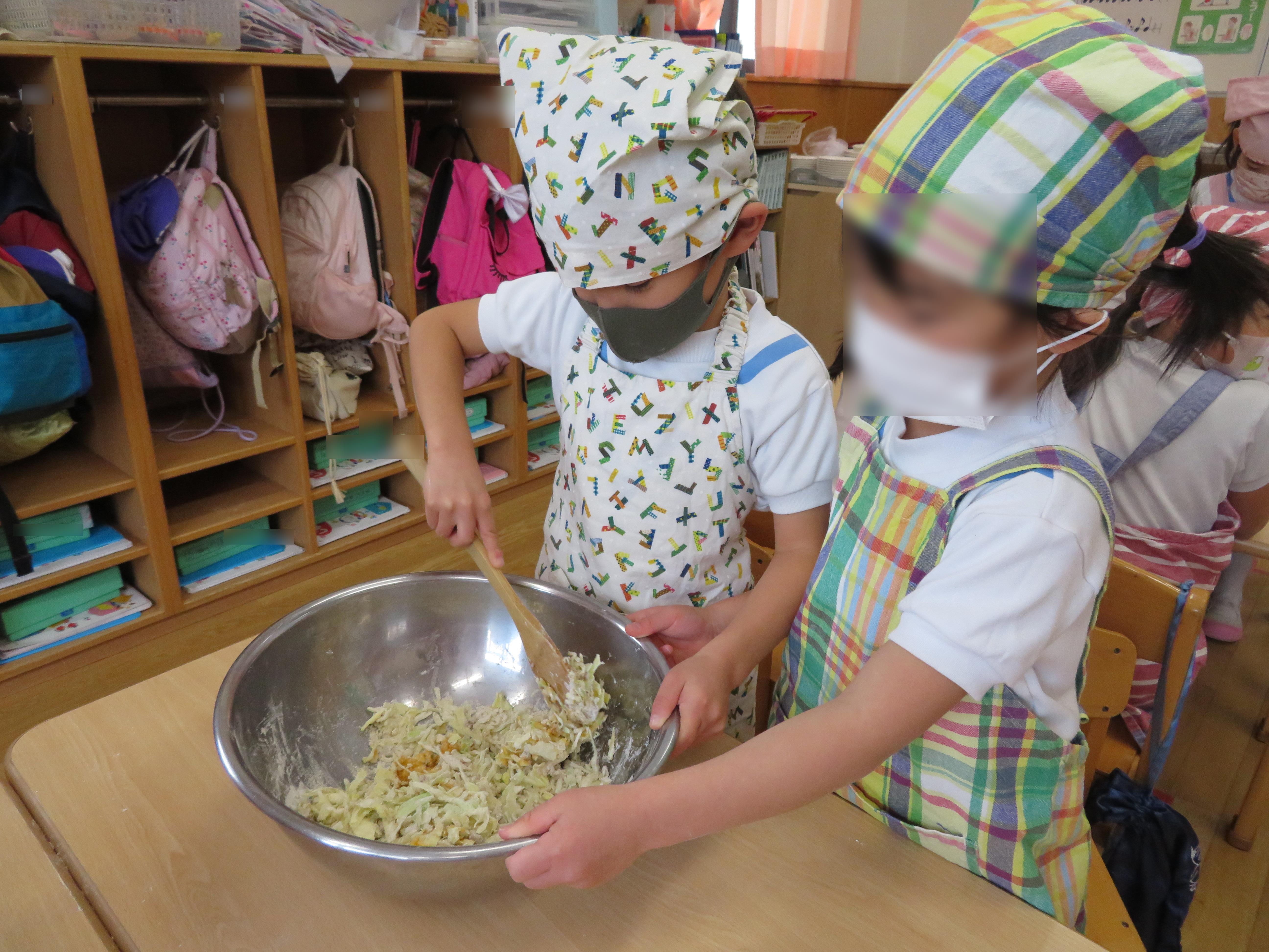 ボールの中にお好み焼き粉、天かす、山芋、合い挽きミンチ、卵をいれて木べらを使って混ぜ合わせました。お友達と協力をしながらしっかりと生地をまぜました。