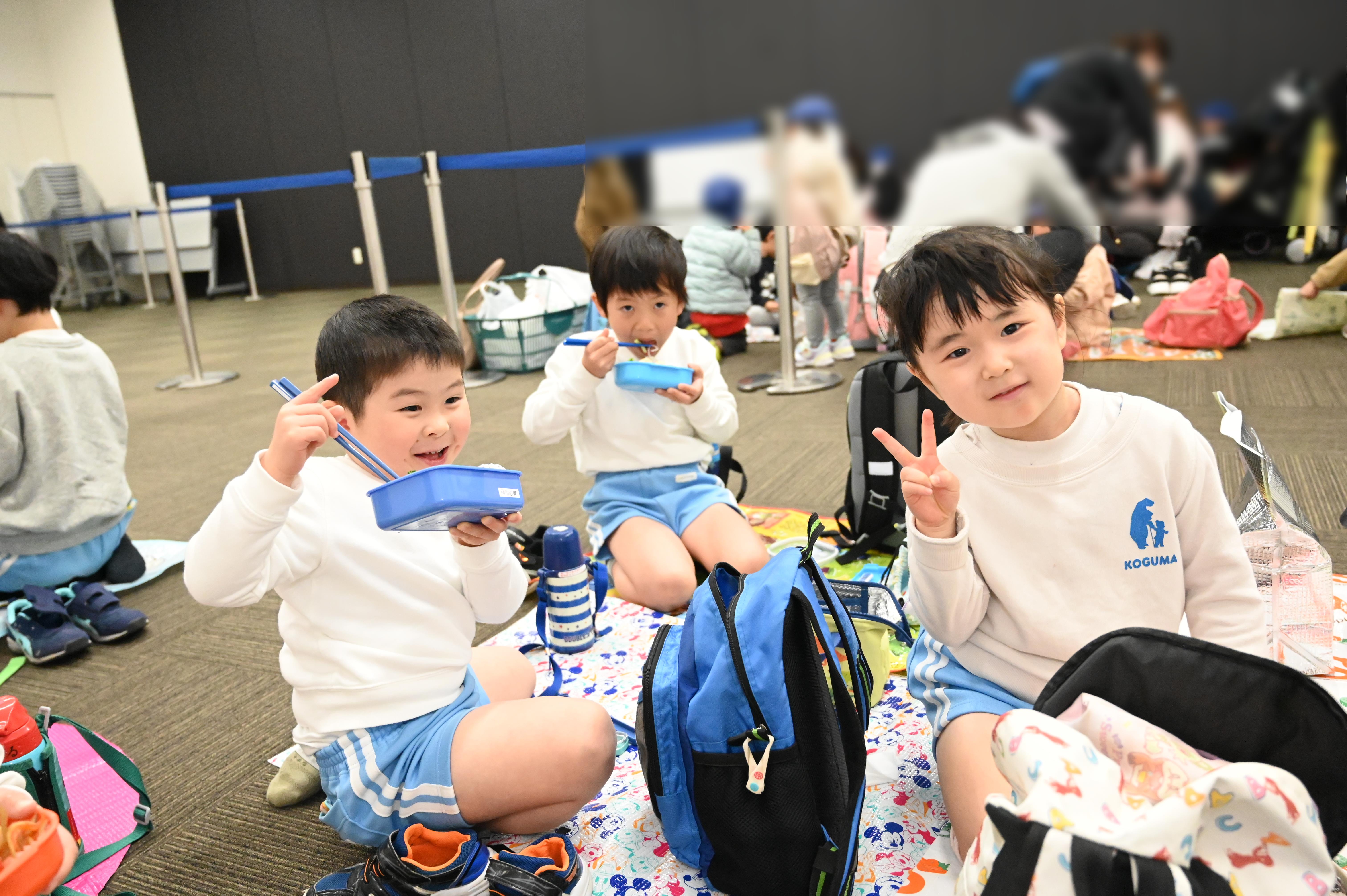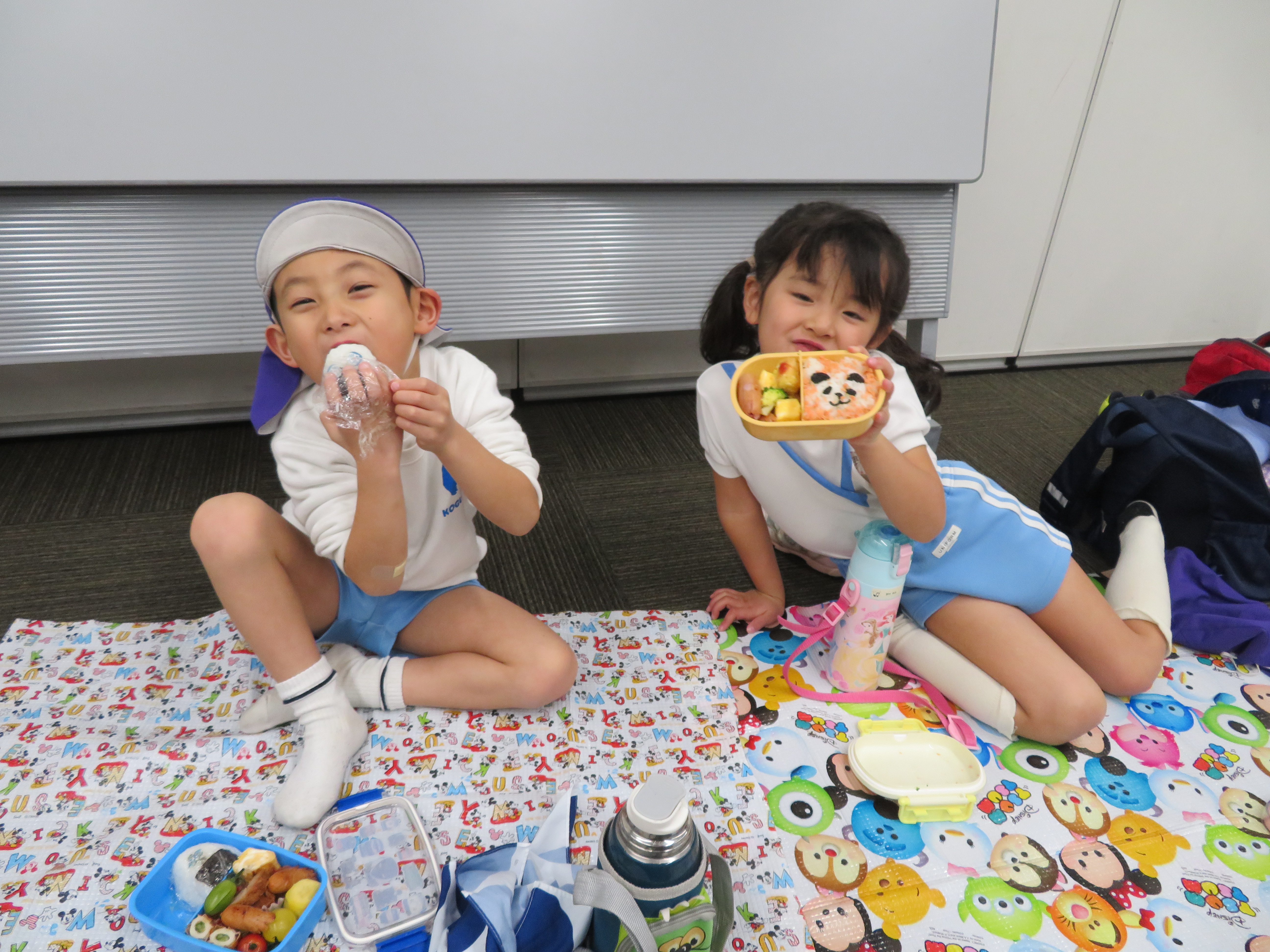 楽しみにしていたお昼ご飯!早く食べたくて準備の時からソワソワする子ども達。友だちとお弁当の自慢をしながら、満面の笑みで食べていました。