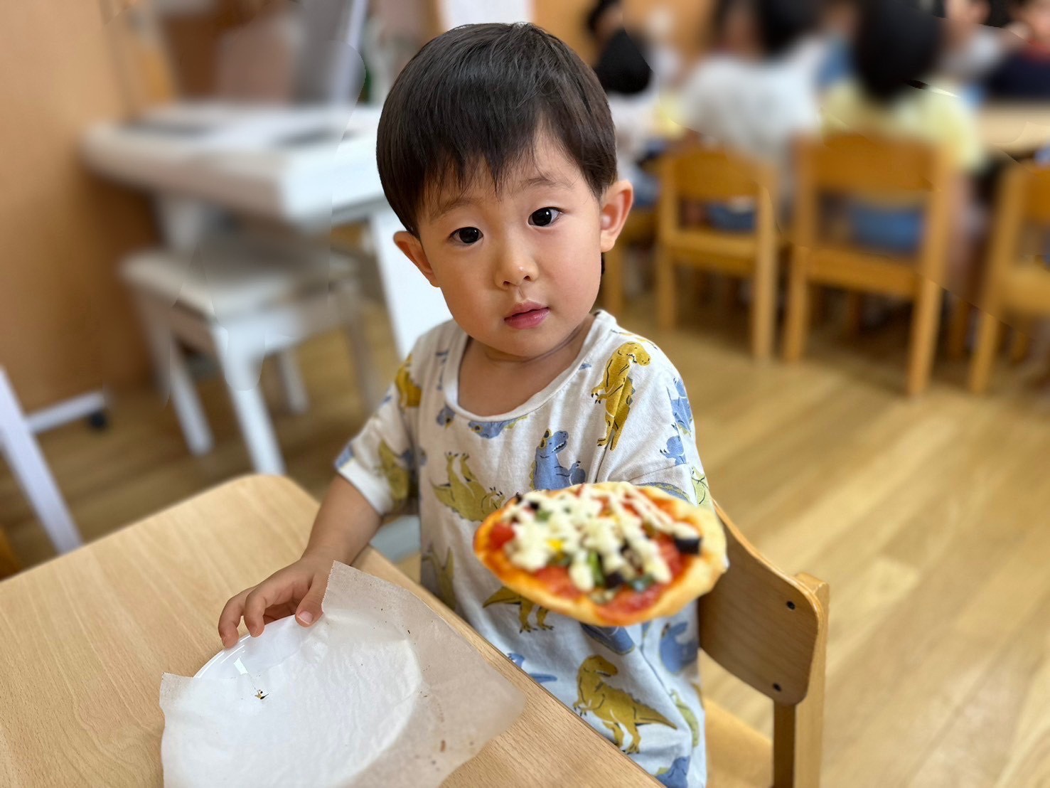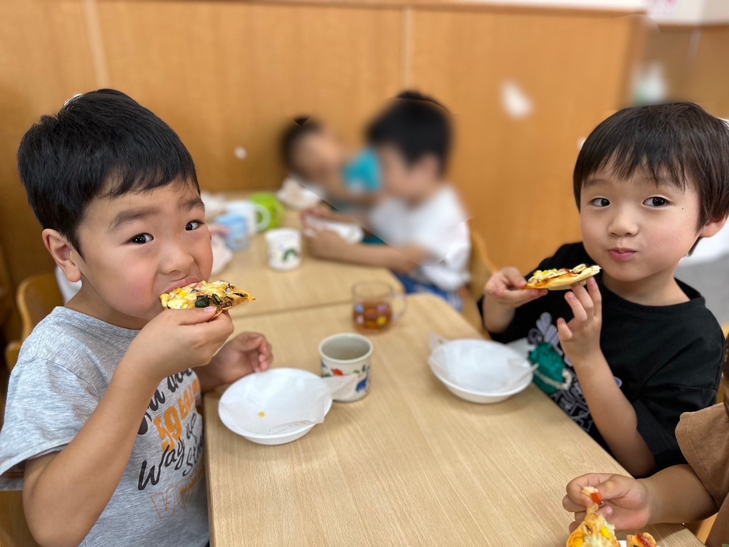 焼き立てのピザを食べました。頑張って作った自分のピザは具がたっぷりでとても美味しかったですね!