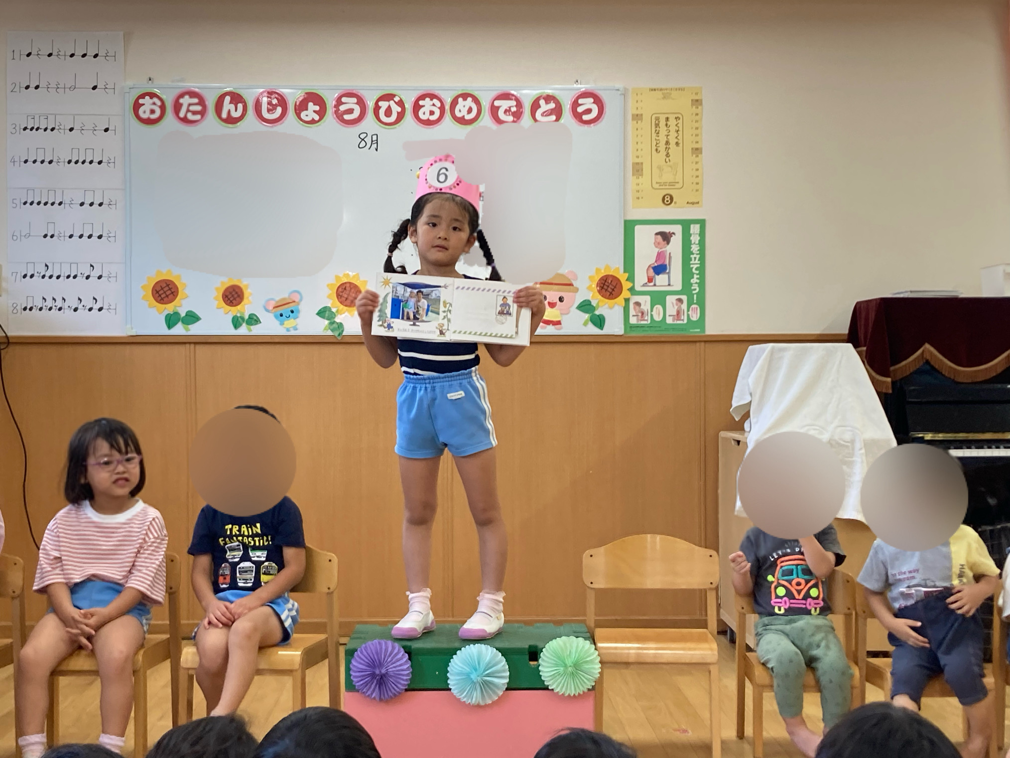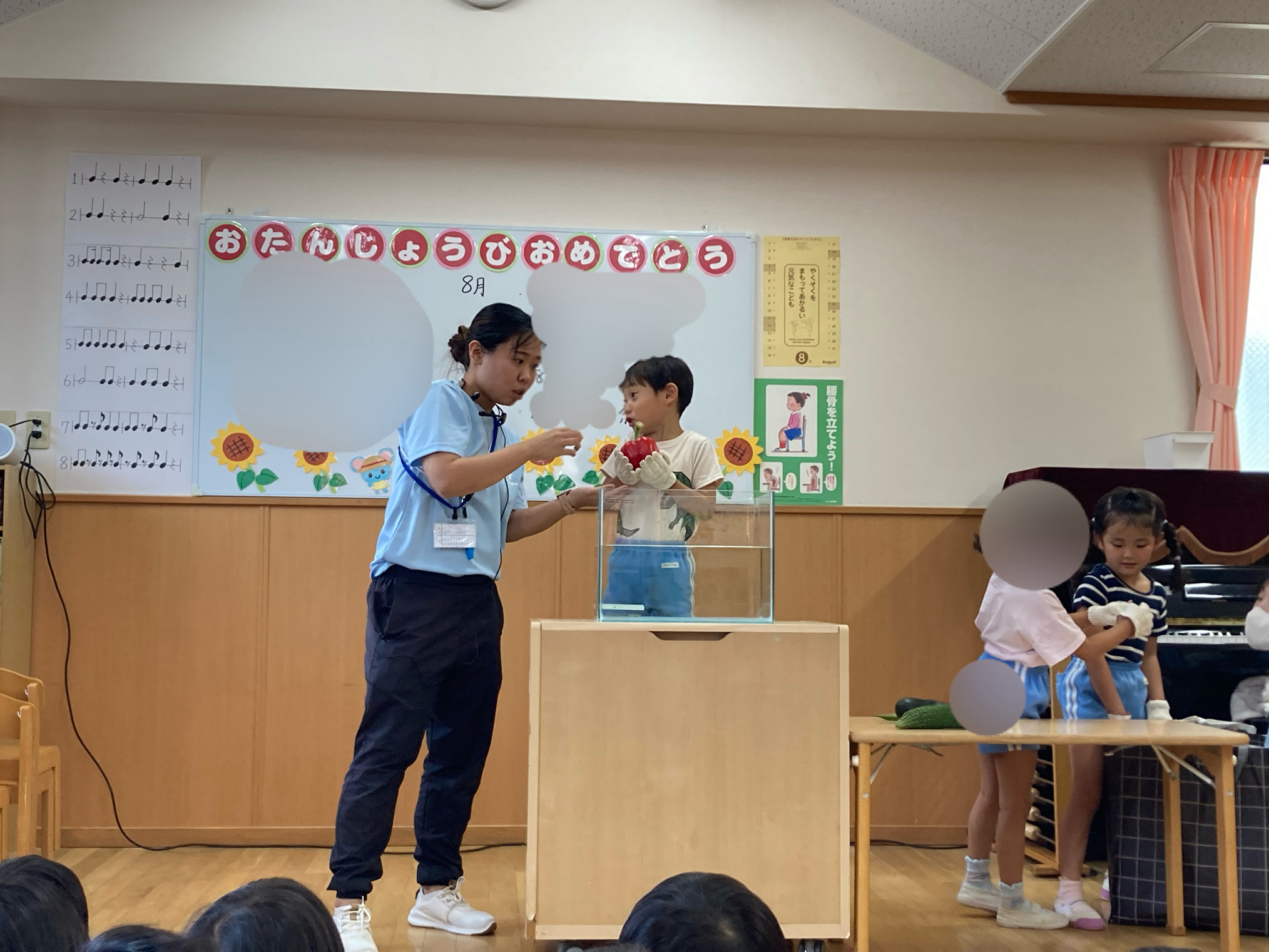 幼児さんでは『水の実験 夏野菜は水に浮く?沈む?』を見ました。たくさんの夏野菜が出てきて「知ってるでー!」と教えてくれました。みんなの代表として8月生まれのひかり組に手伝ってもらい実験をしました。どの野菜が沈むのか、浮くのか興味津々!!みんなで楽しんで参加しました。