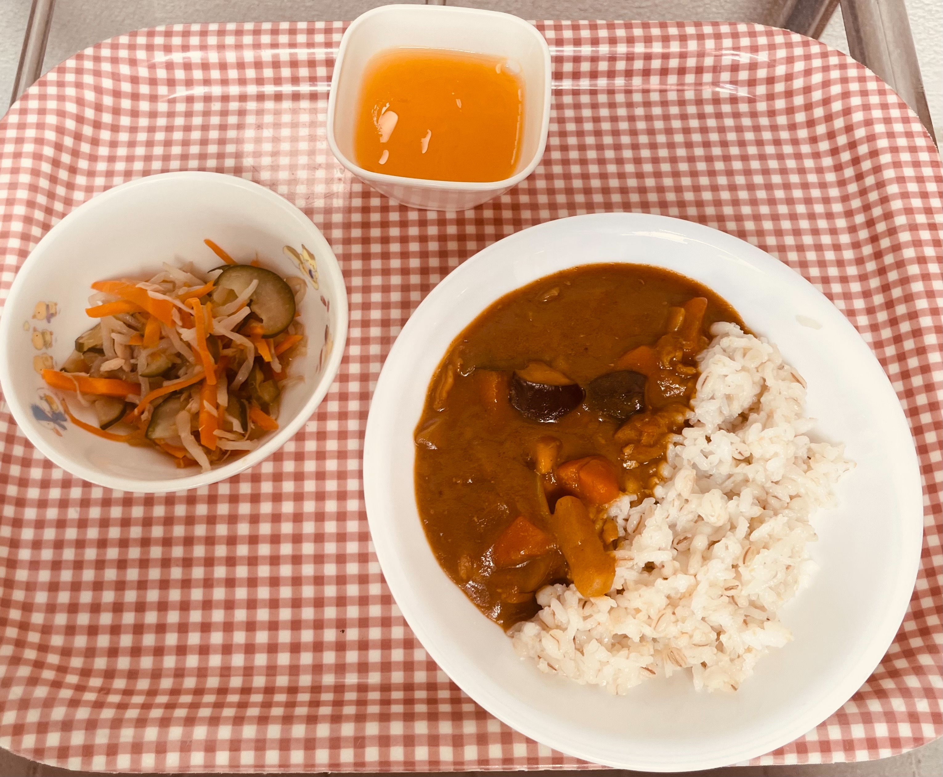 給食は夏野菜カレーライス、もやしのツナ和え、ゼリー