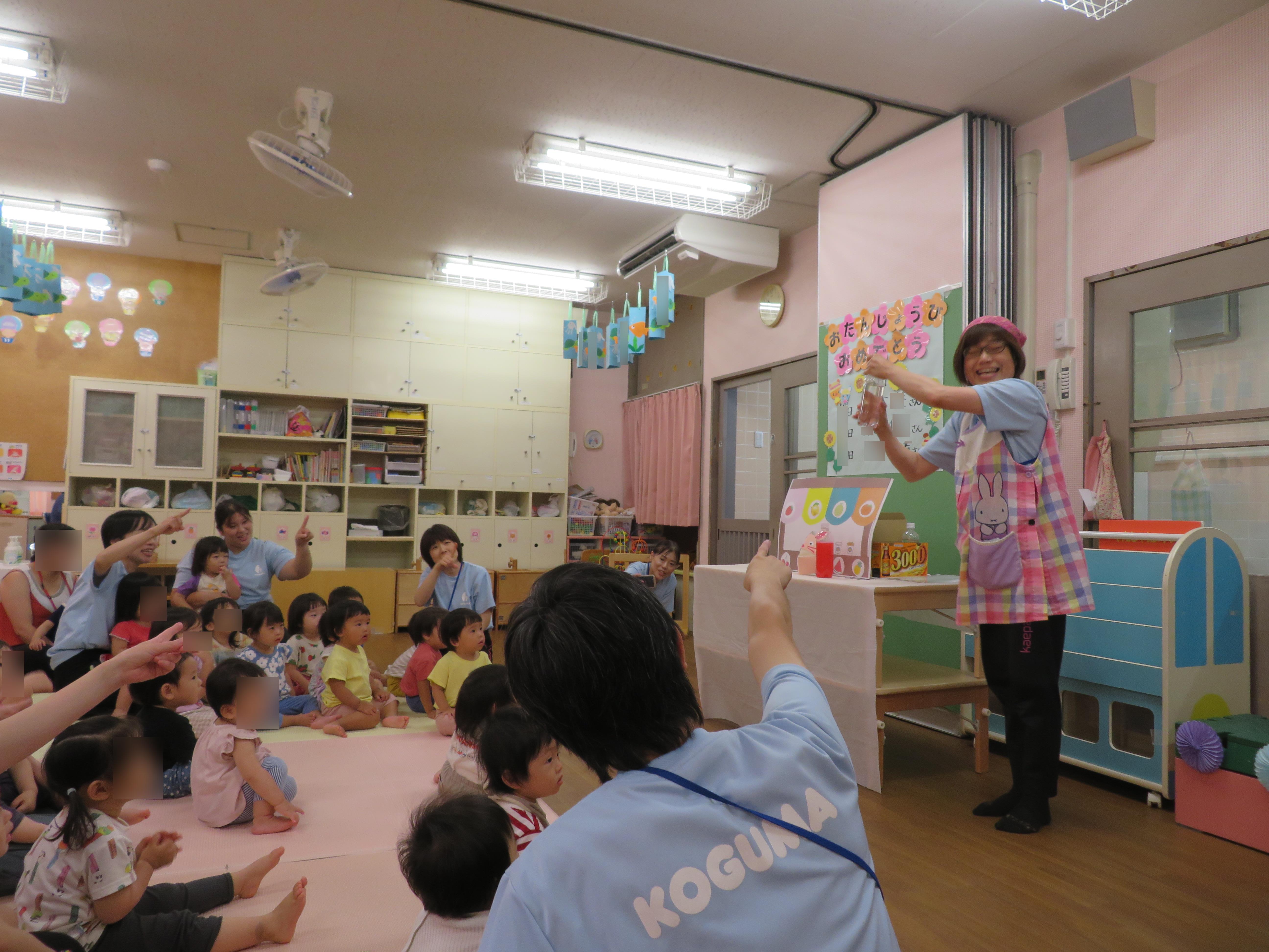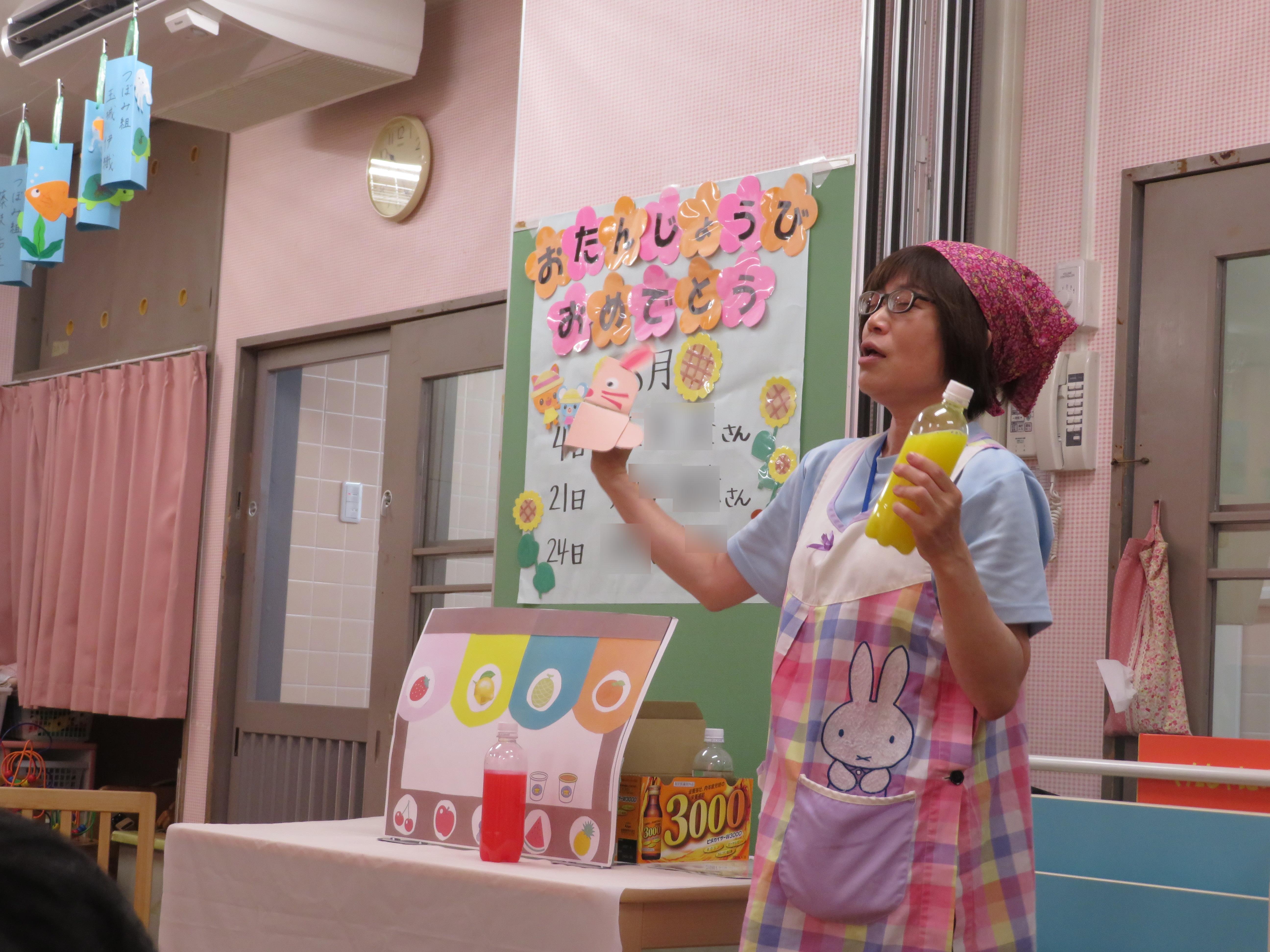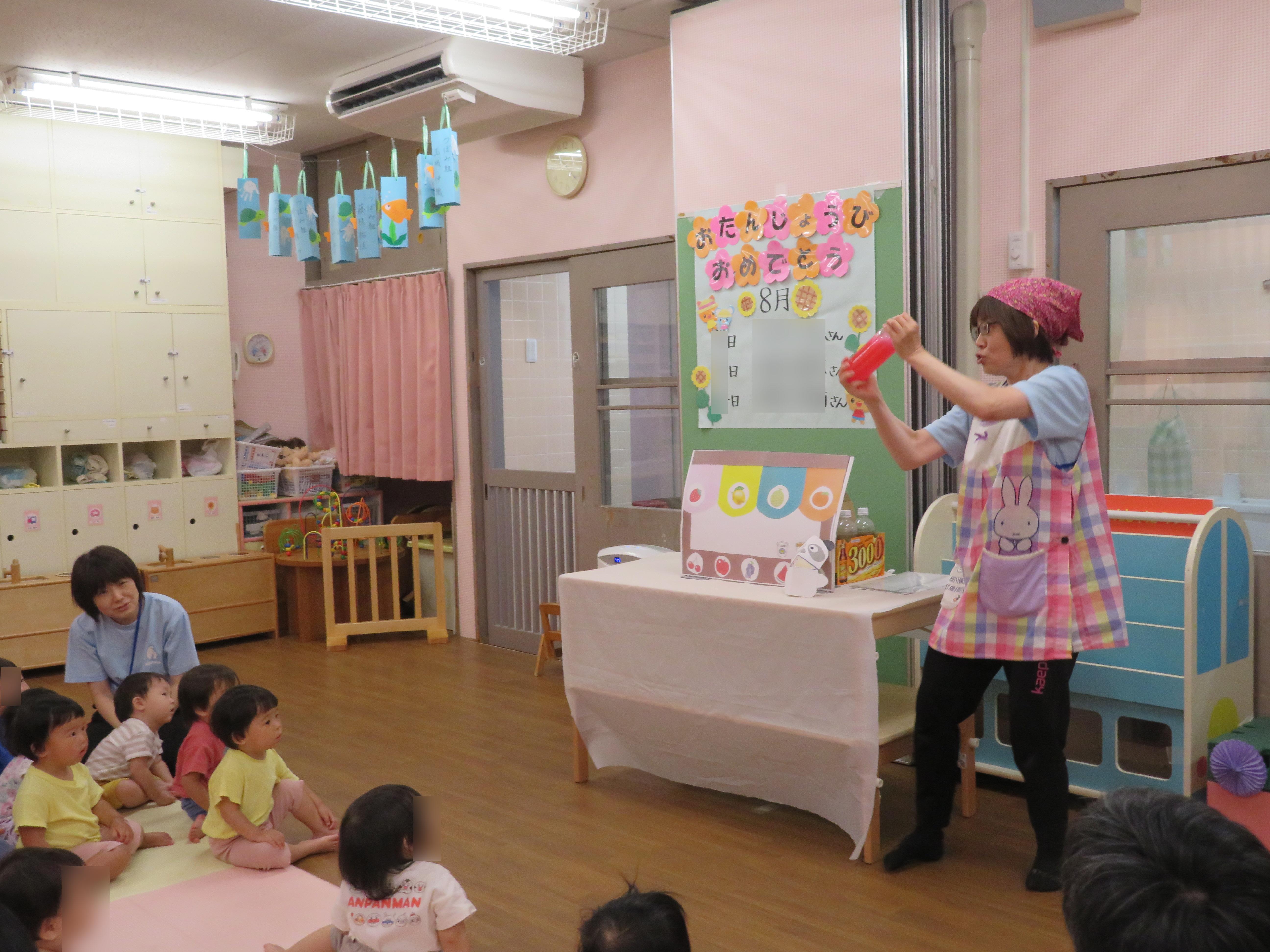 乳児さんのお楽しみは『魔法の色水屋さん』でした。みんなで掛け声をかけると水が魔法の力でジュースに変身!ジュースになって不思議そうに見つめたり、喜ぶ子どもたちでした。
