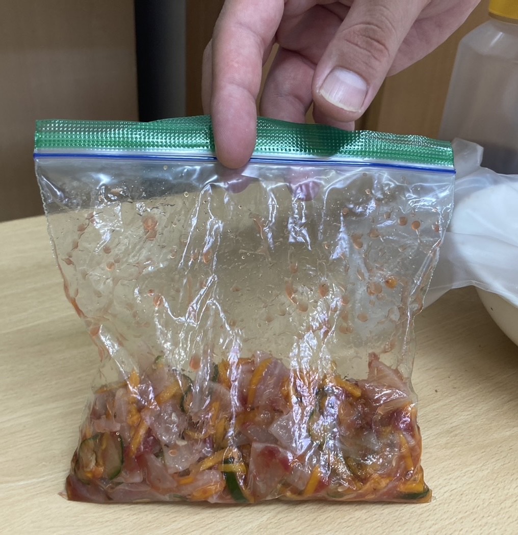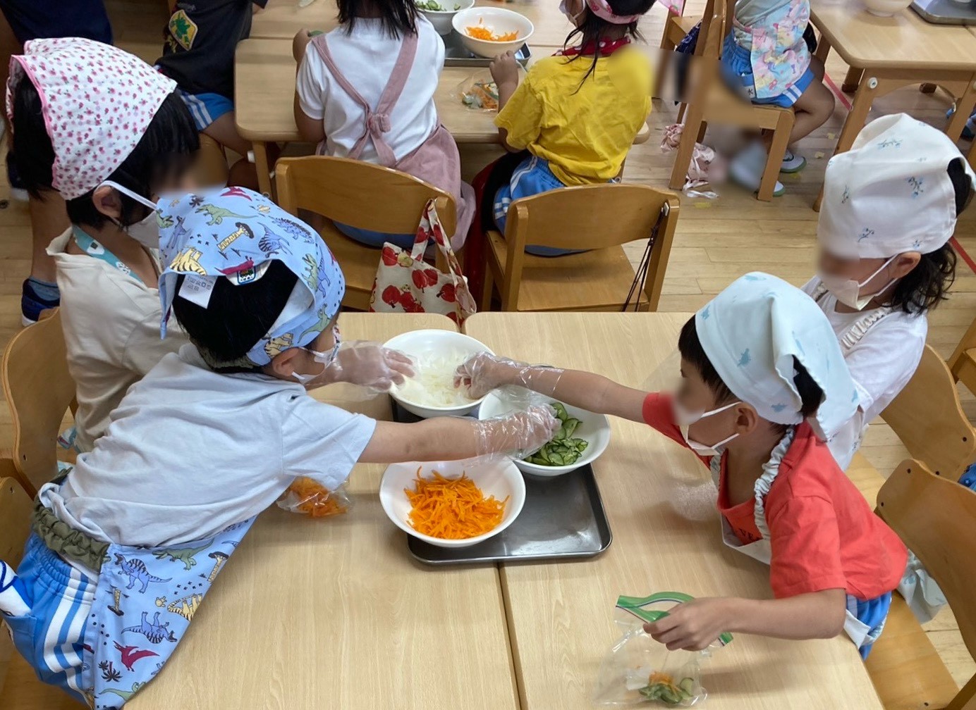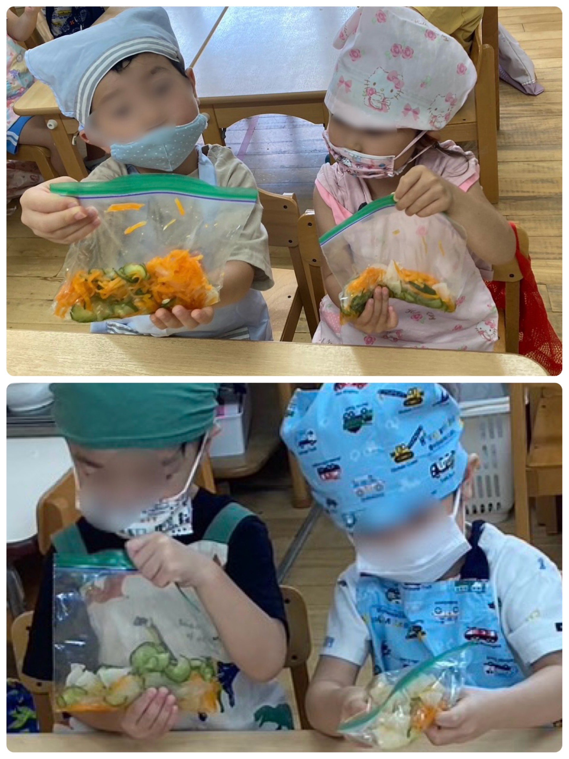 ほし組で大根の梅和えのクッキングをしました。給食室でスチームした大根、にんじん、きゅうりをジップロックに入れていきました。