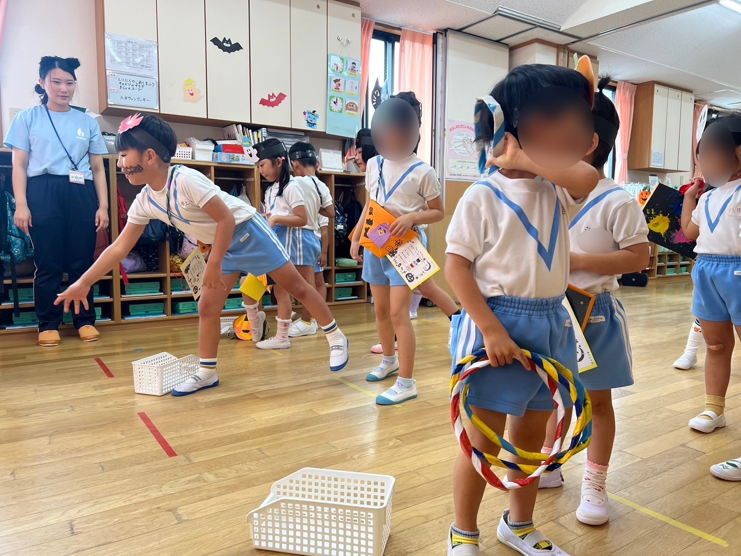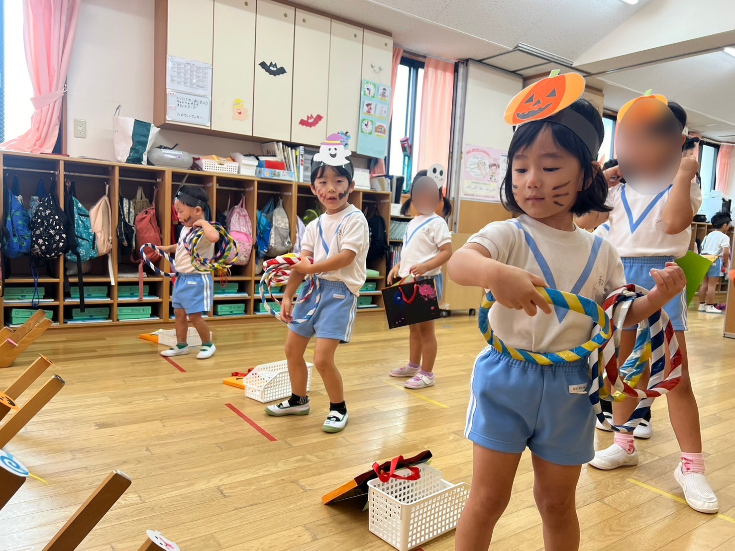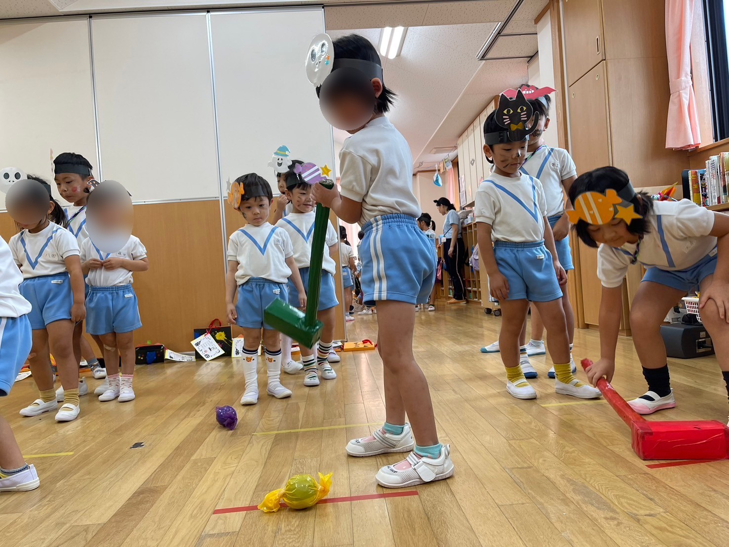 ほし組・そら組・ひかり組はハロウィンゲームをしました。お菓子釣りに福笑い。輪投げやゴルフを楽しみました。