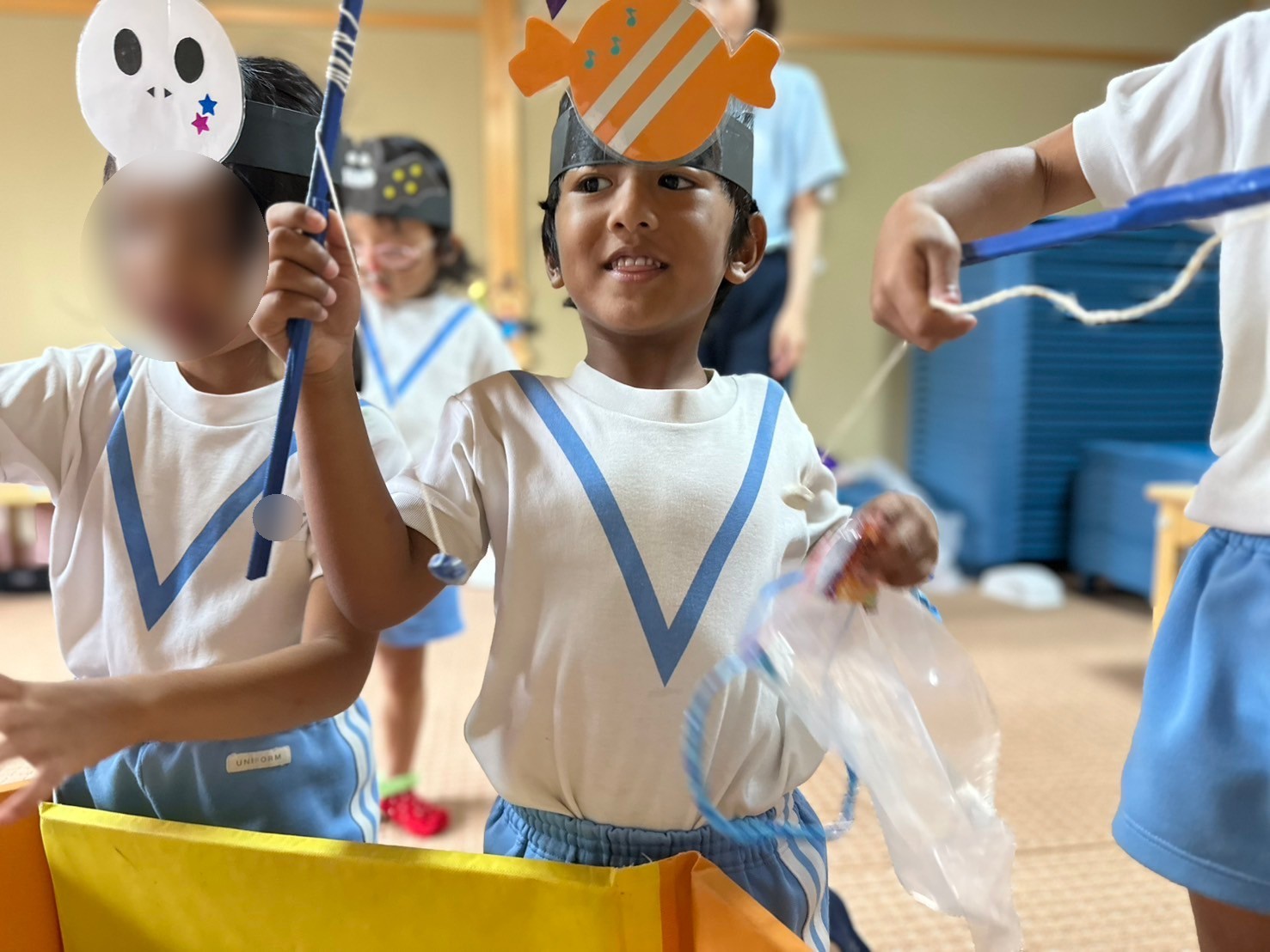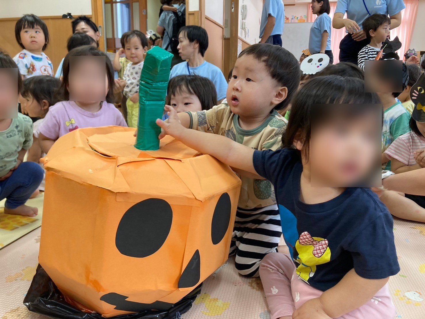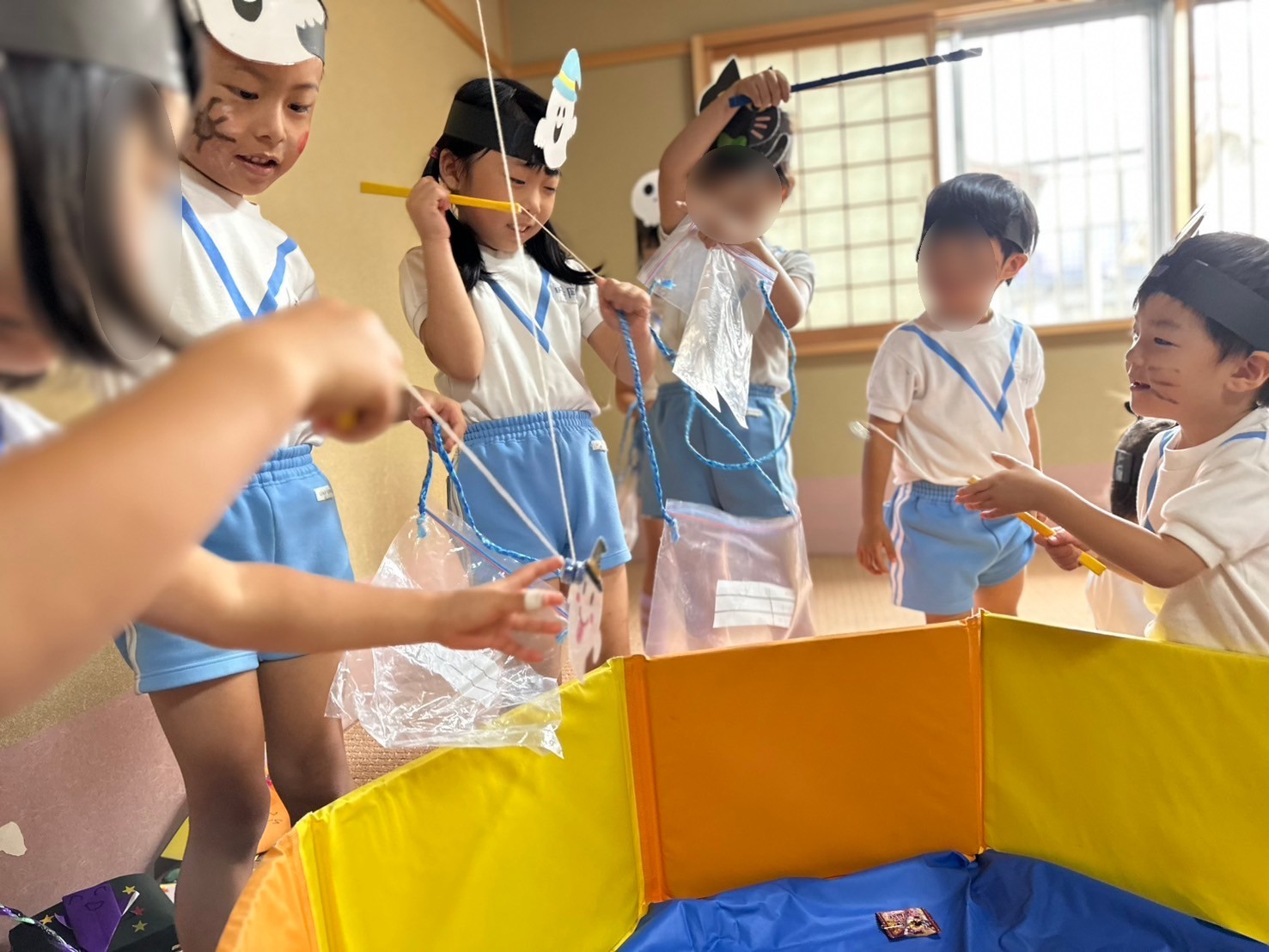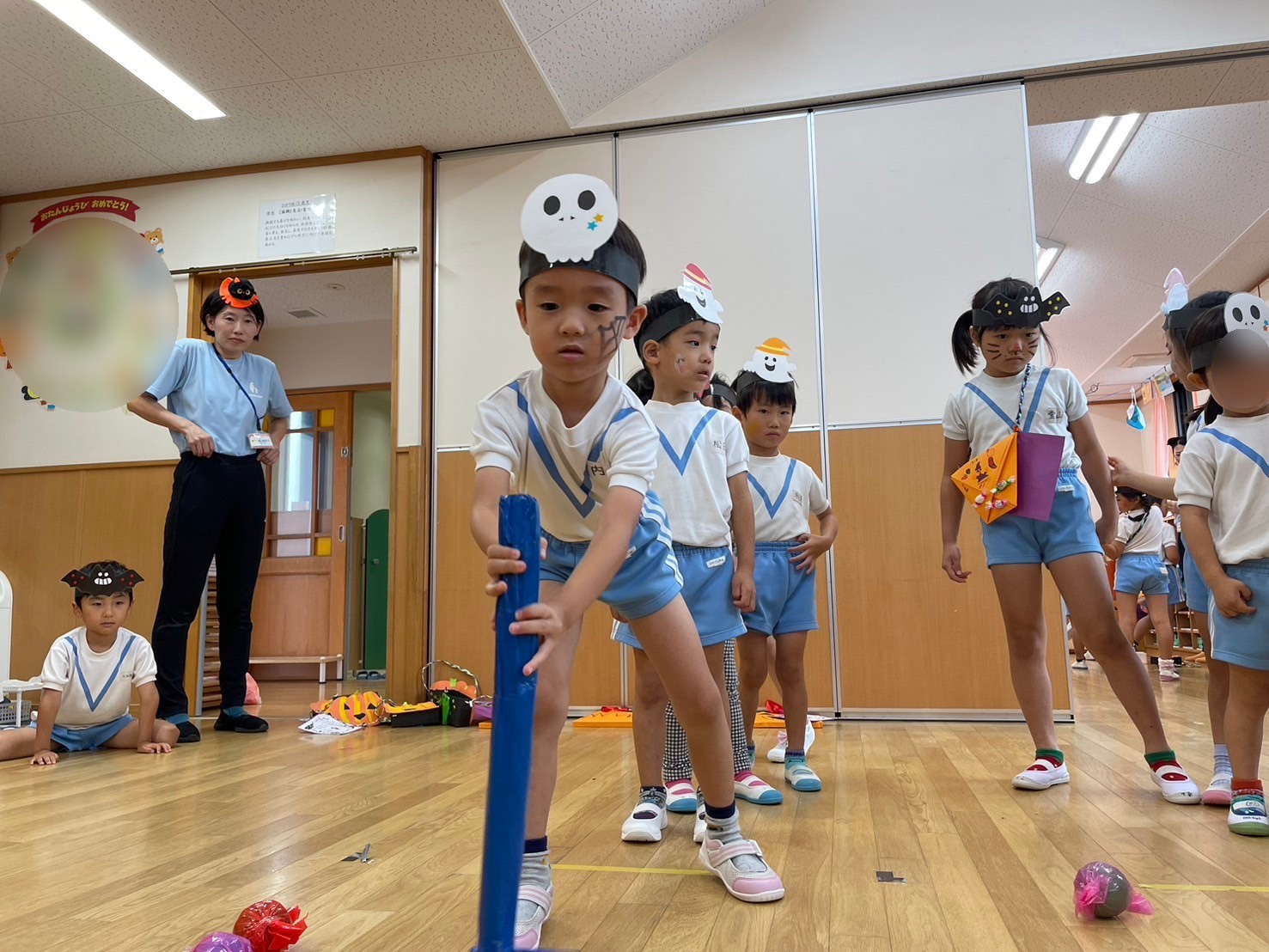 ほし組・そら組・ひかり組はハロウィンゲームをしました。お菓子釣りに福笑い。輪投げやゴルフを楽しみました。