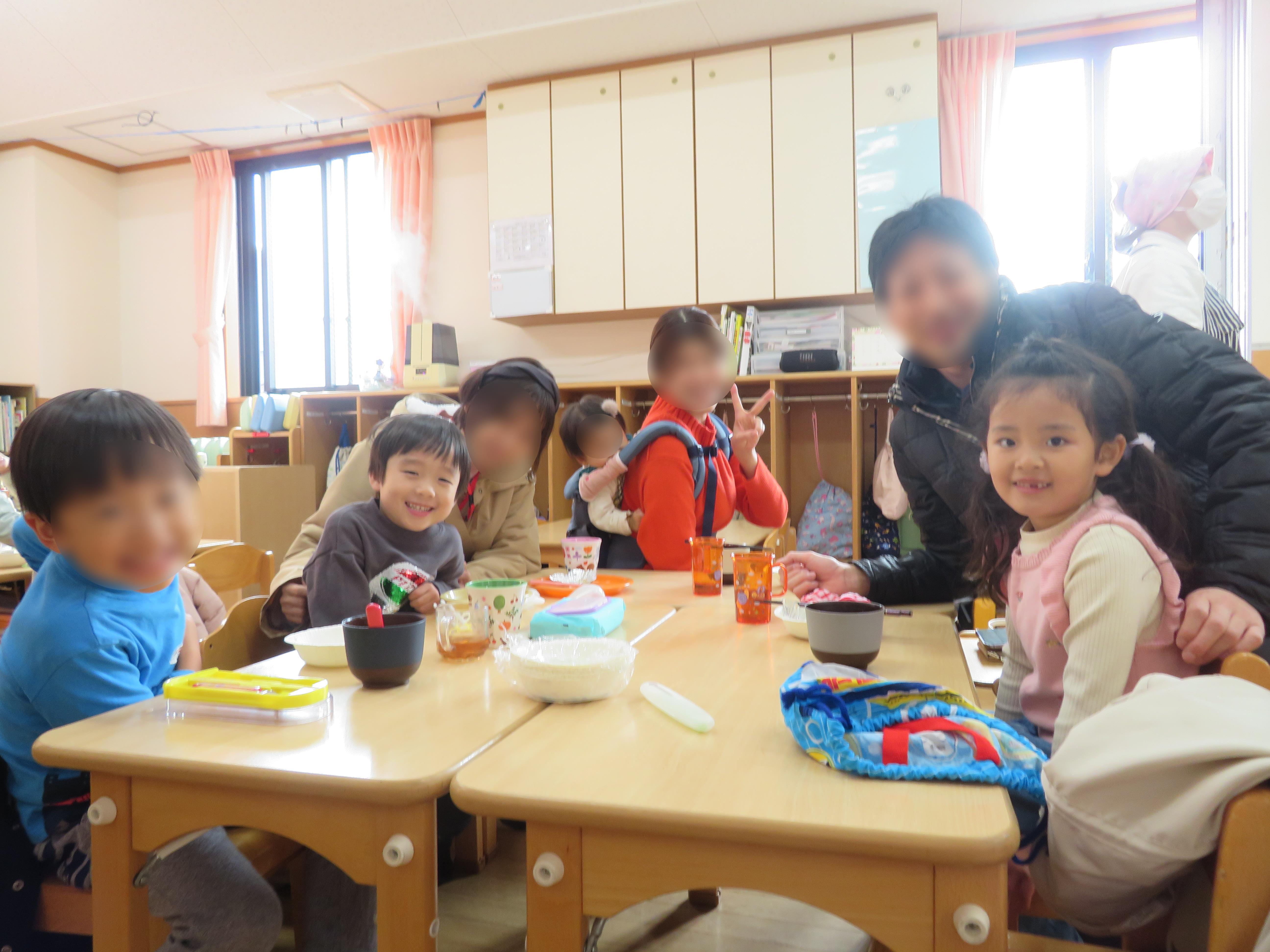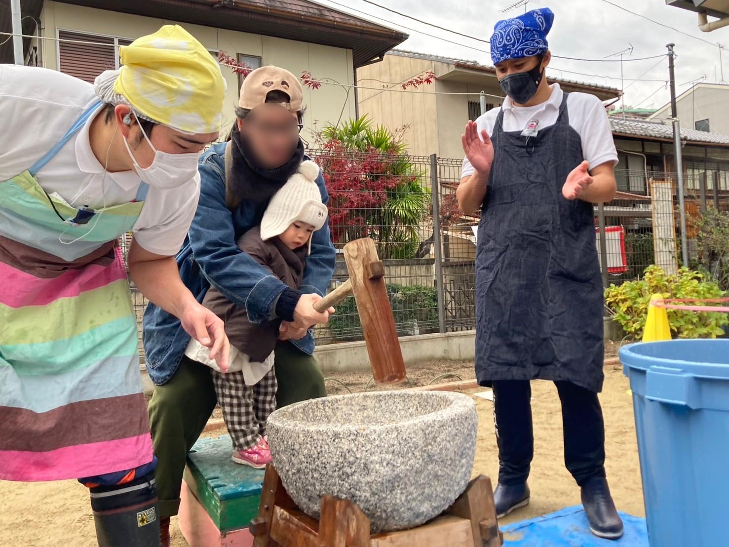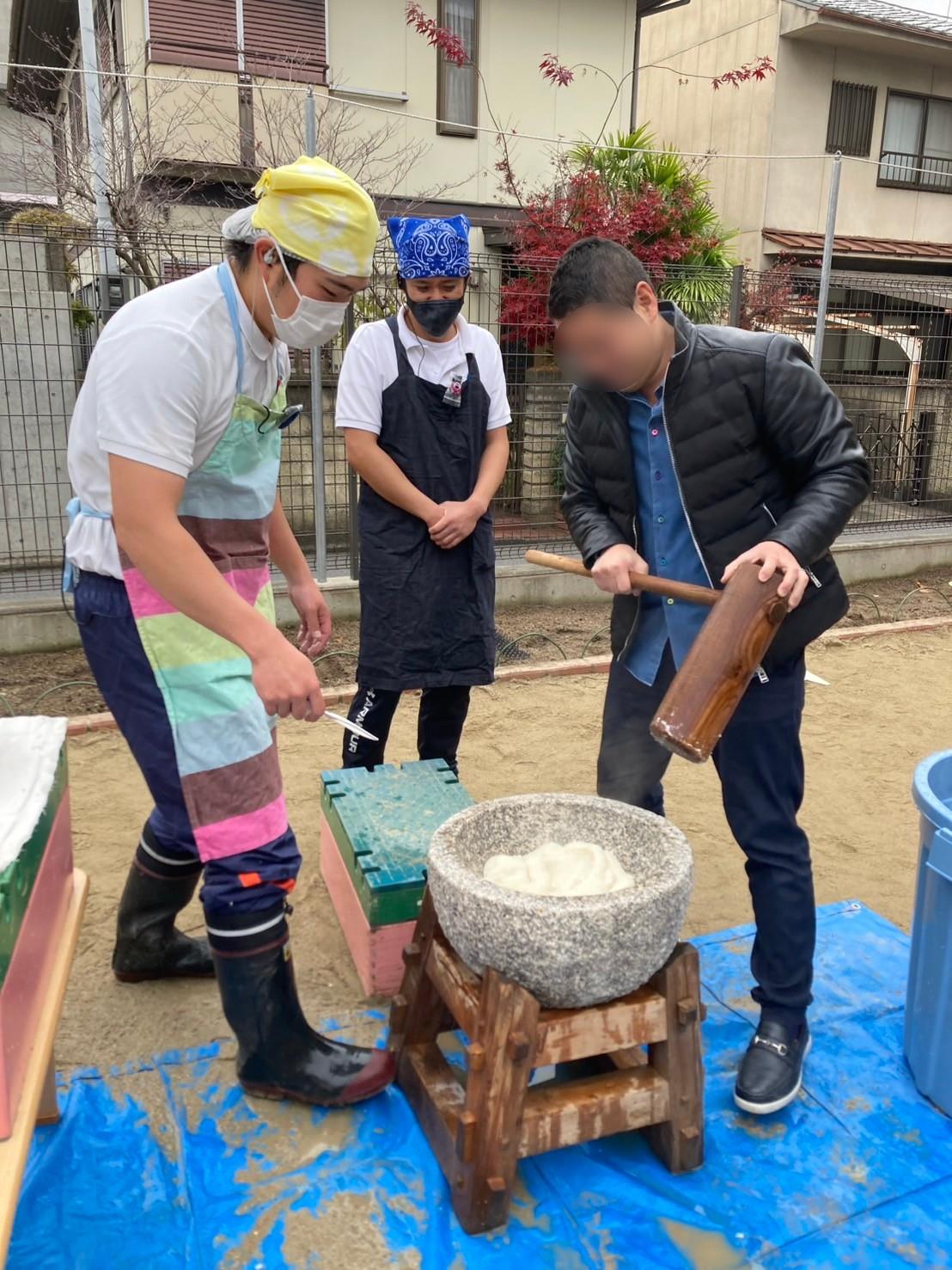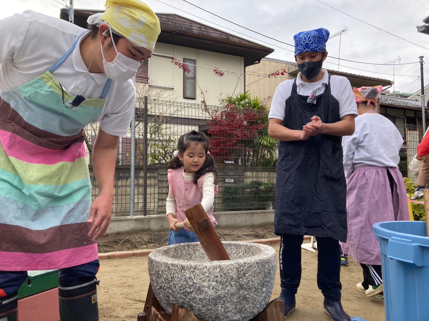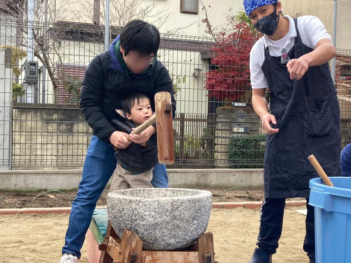 皆で、「よいしょ~~~ よいしょ~~~ 」と掛け声をしながら頑張ってついてくれえていました。保護者の方の協力もあり、たくさんのお餅をつくことができました!