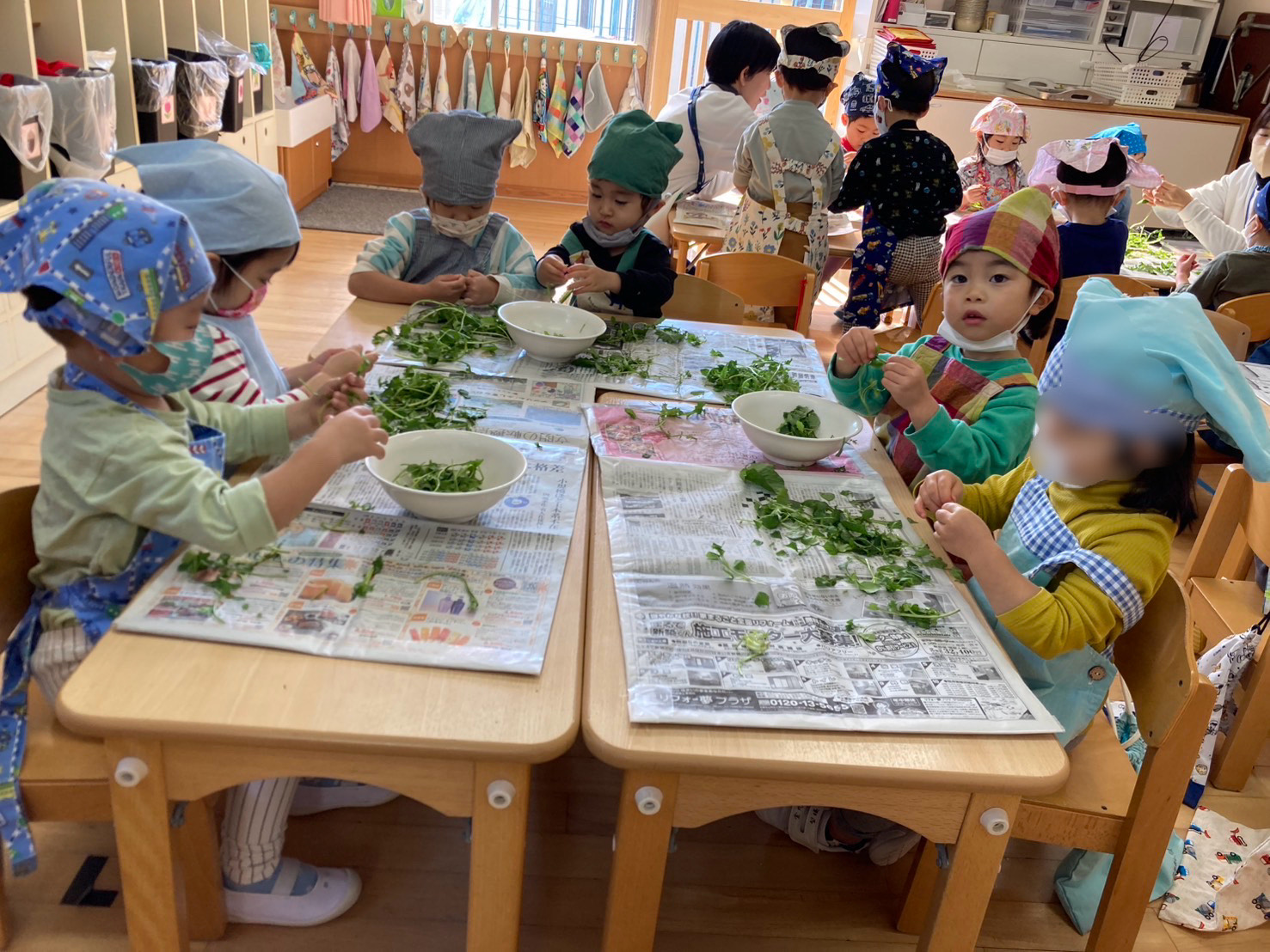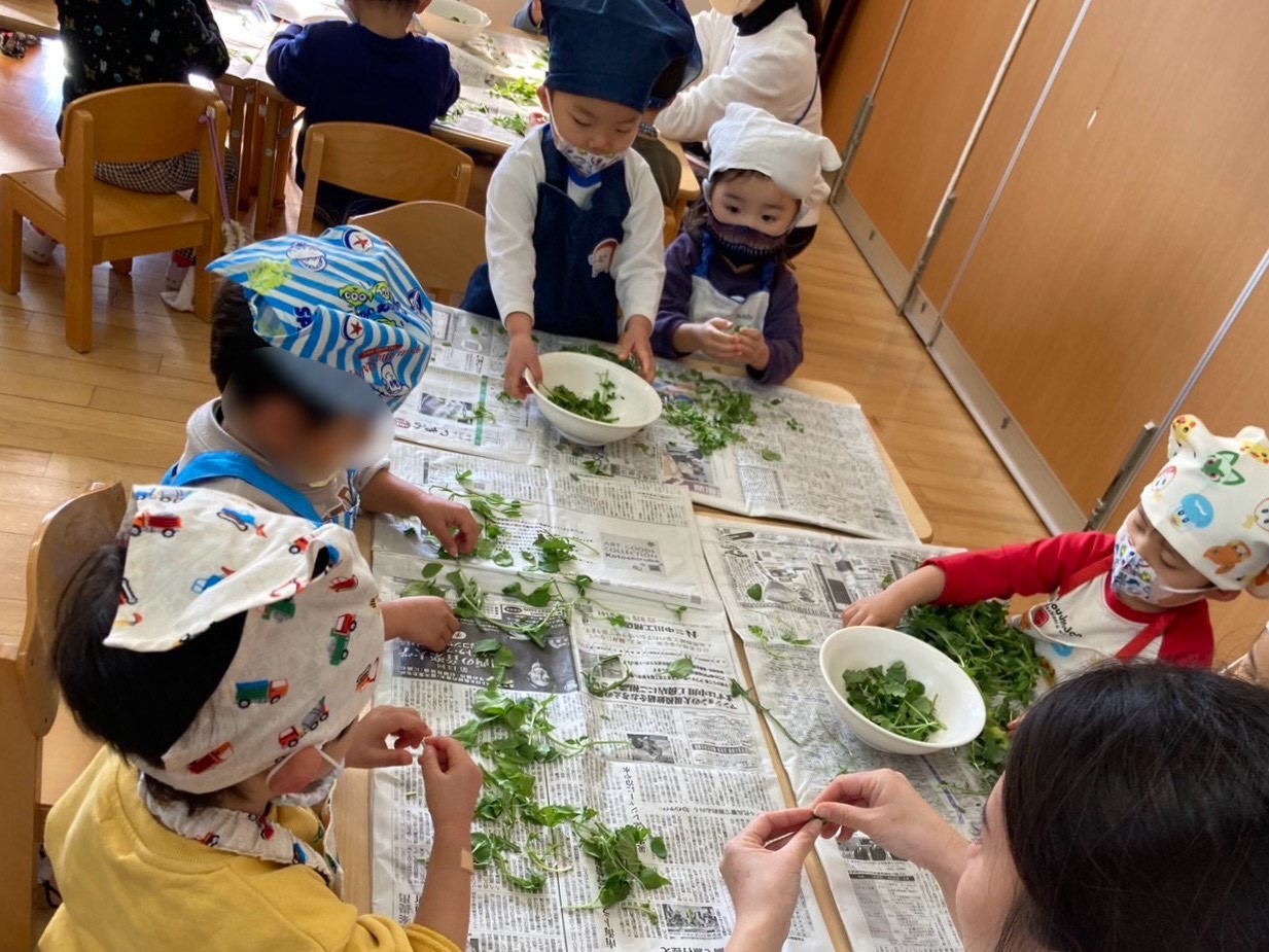 いろいろな葉っぱを見てから、みんなで頑張って、ちぎりました。 すずな、すずしろは調理室で、刻みました。