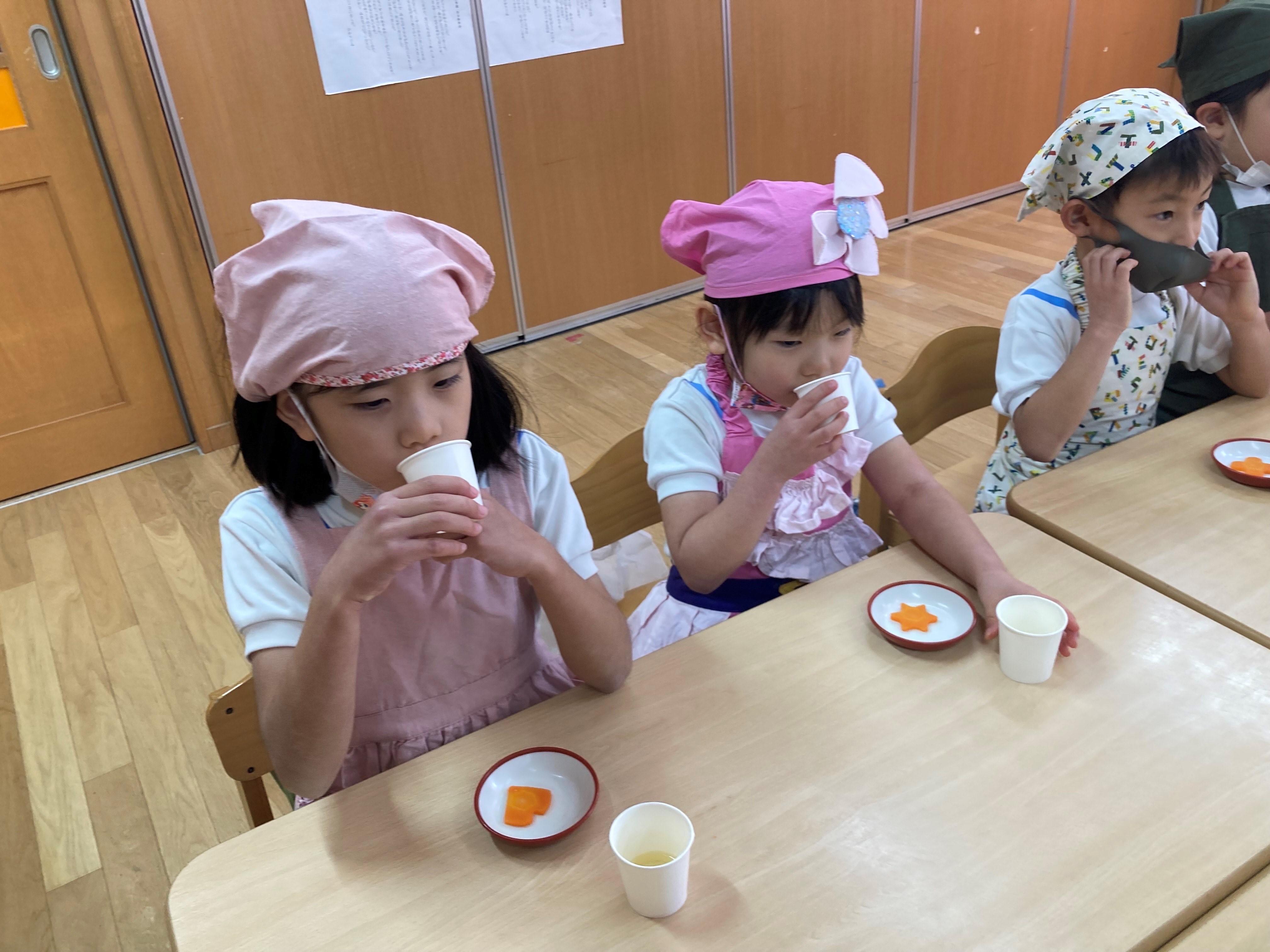 次に出汁の飲み比べをしました。香りを楽しんでから、昆布出汁とかつお出汁を飲みました。全員、味を見分けることができました。出汁が苦手な人もいました。
