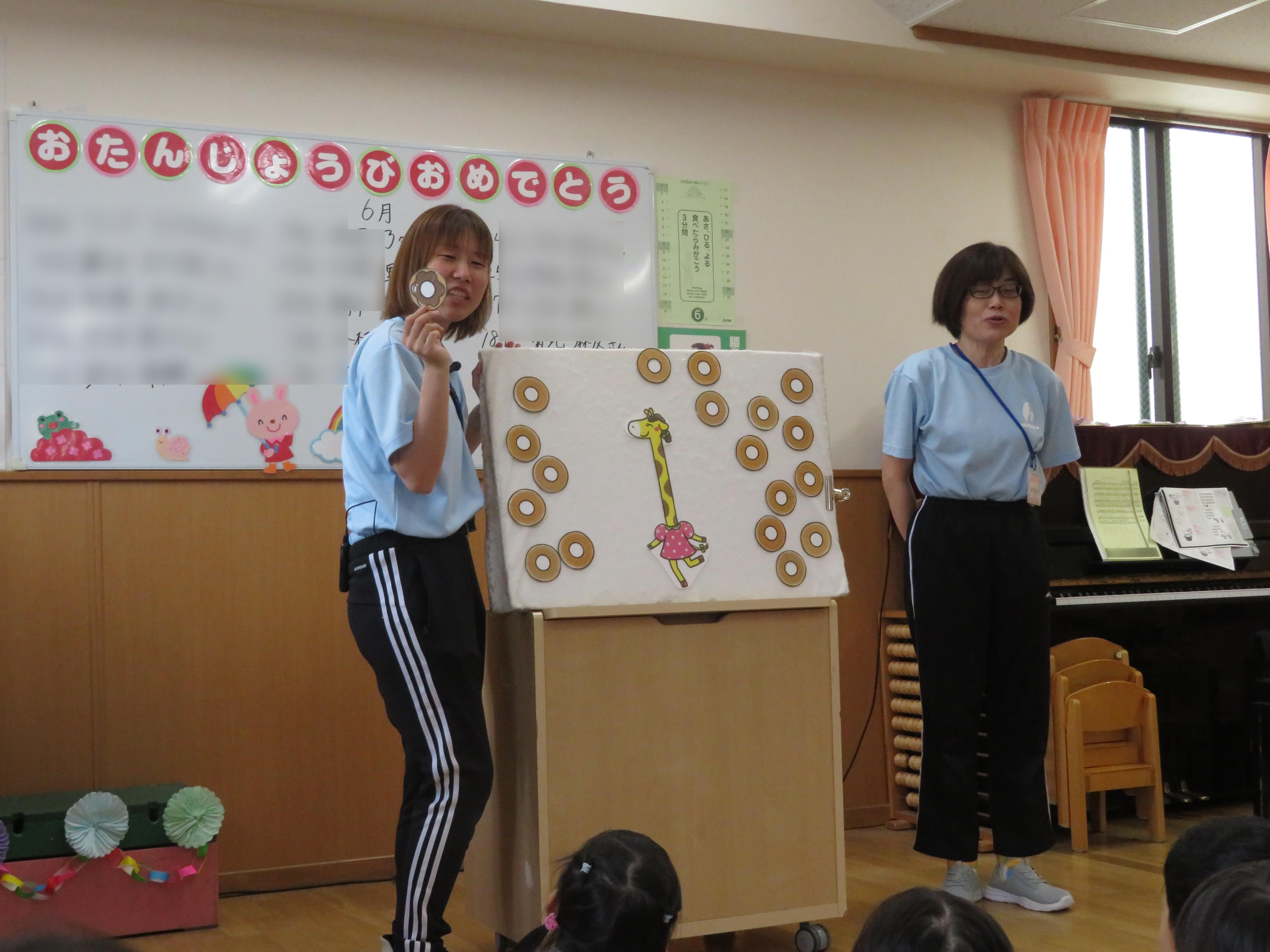 お誕生日会がありました。お誕生児さんはドキドキしながらも何歳になったのか指で教えてくれたり、インタビューに答えてくれたりしました。