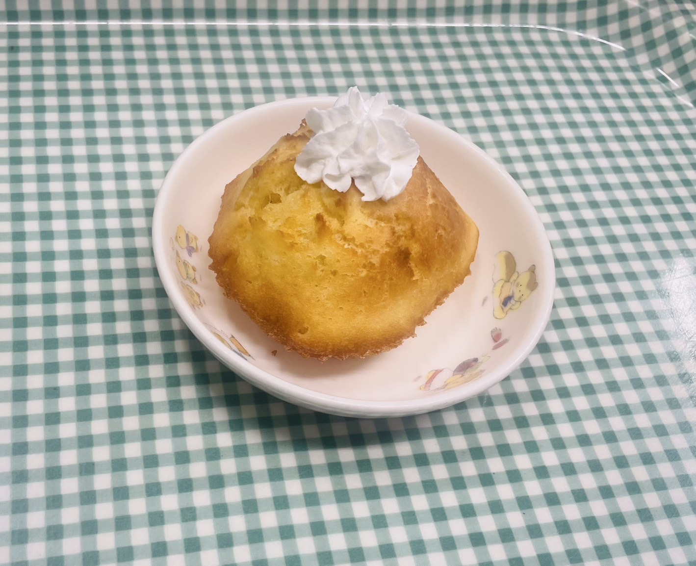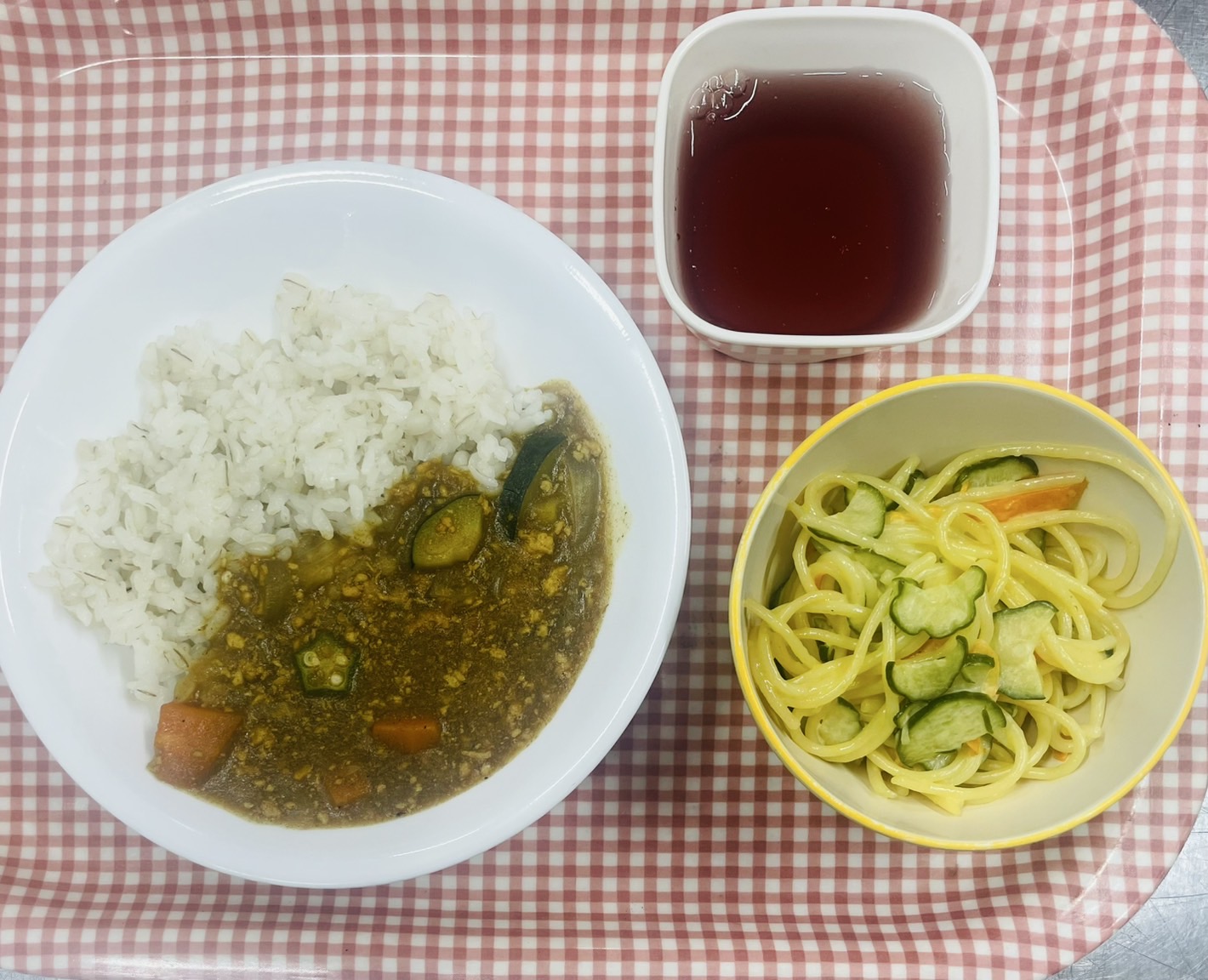 給食はオクラとズッキーニのカレー、スパゲッティサラダ、ゼリーでおやつはさくさくカップケーキです。