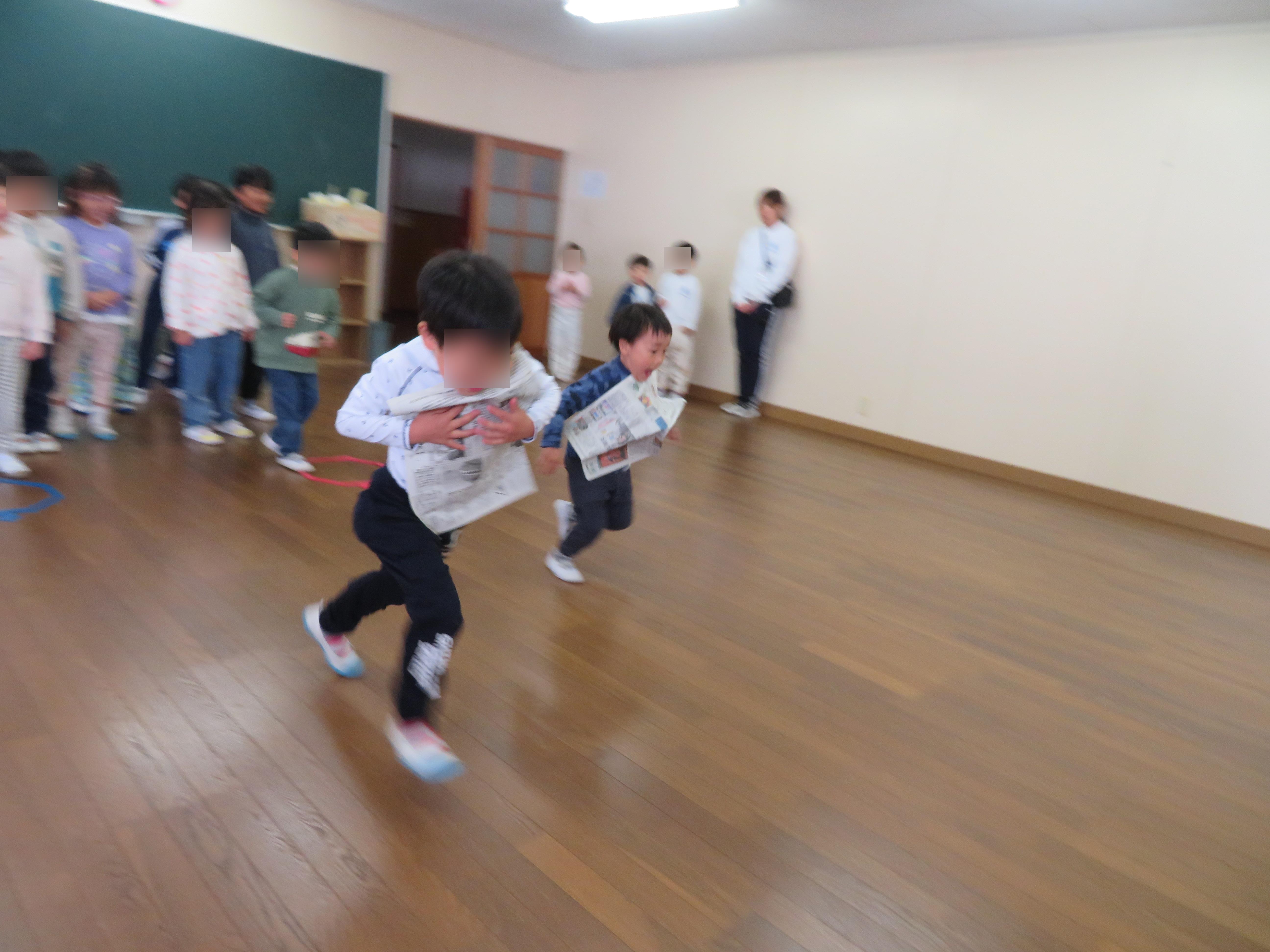 レクリエーションでは手を使わずに新聞紙を落とさないように歩いたり、走ったりするゲームを楽しみました。