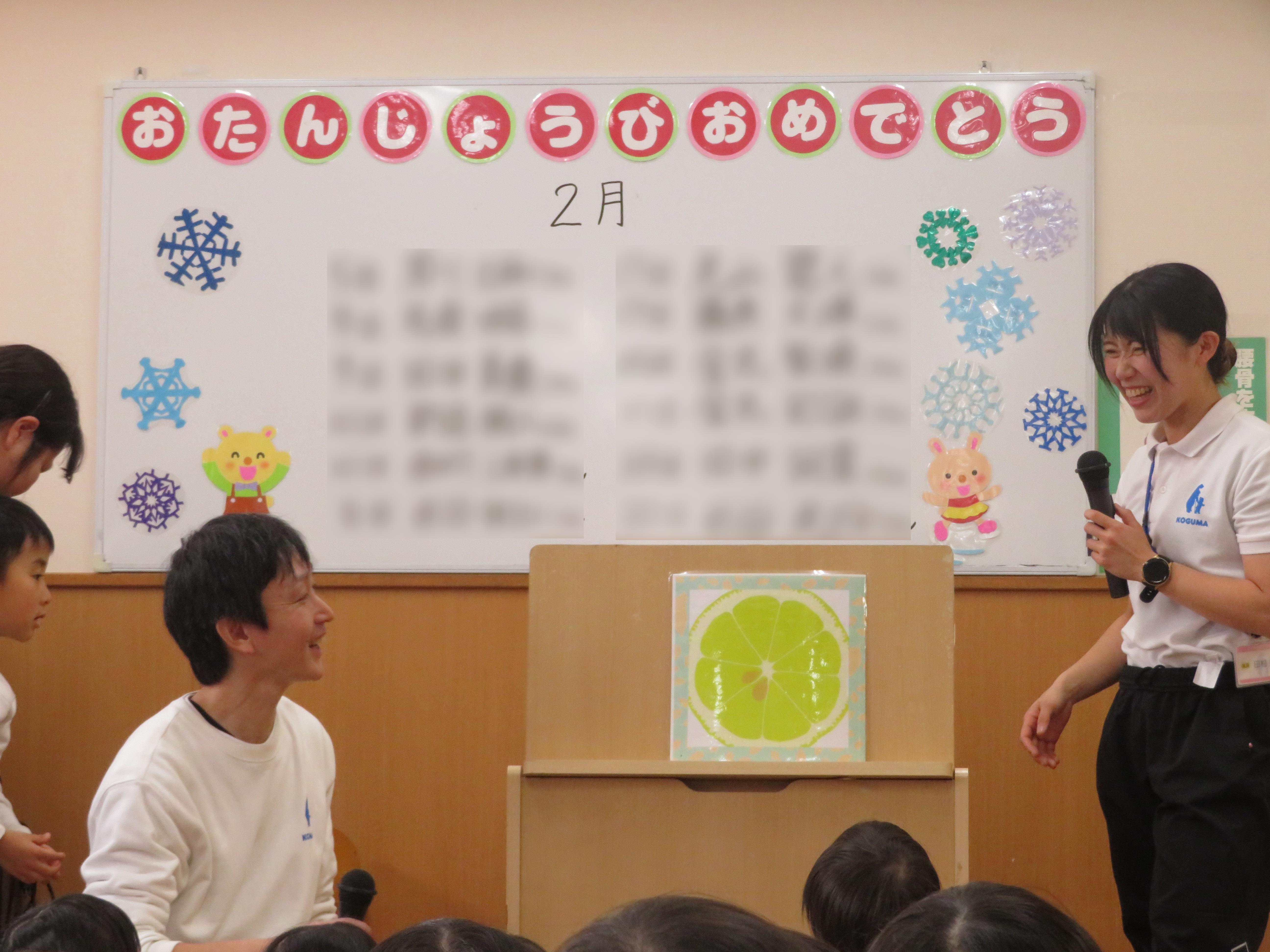 今日は2月のお誕生日会がありました。自分の得意な事や頑張っていることをみんなの前で発表して盛り上がりました。